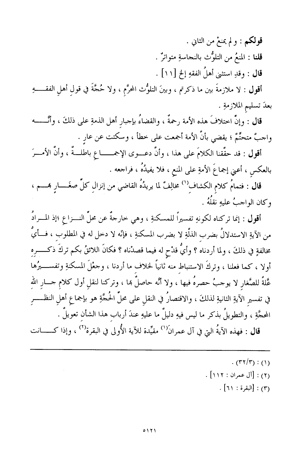 أقول: إنما تركناه لكونه تفسيرًا للمسكنة، وهي خارجة عن محل النزاع؛ إذ المراد من الآية الاستدلال بضرب الذلة لا بضرب المسكنة، فإنه لا دخل له في المطلوب، فأي مخالفة في ذلك، ولما أردناه؟ وأي قدح له فيما قصدناه؟ فكان اللائق بكم ترك ذكره أولًا، كما فعلنا، وترك الاستنباط منه ثانيًا لخلاف ما أردنا، وجعل المسكنة وتفسيرها علة للصغار لا يوجب حصره فيها، ولا أنه حاصل بها، وتركنا لنقل أول كلام جار الله في تفسير الآية الثانية لذلك، والاقتصار في النقل على محل الحجة هو بإجماع أهل النظر المحجة، والتطويل بذكر ما ليس فيه دليل ما عليه عند أرباب هذا الشأن تعويل.