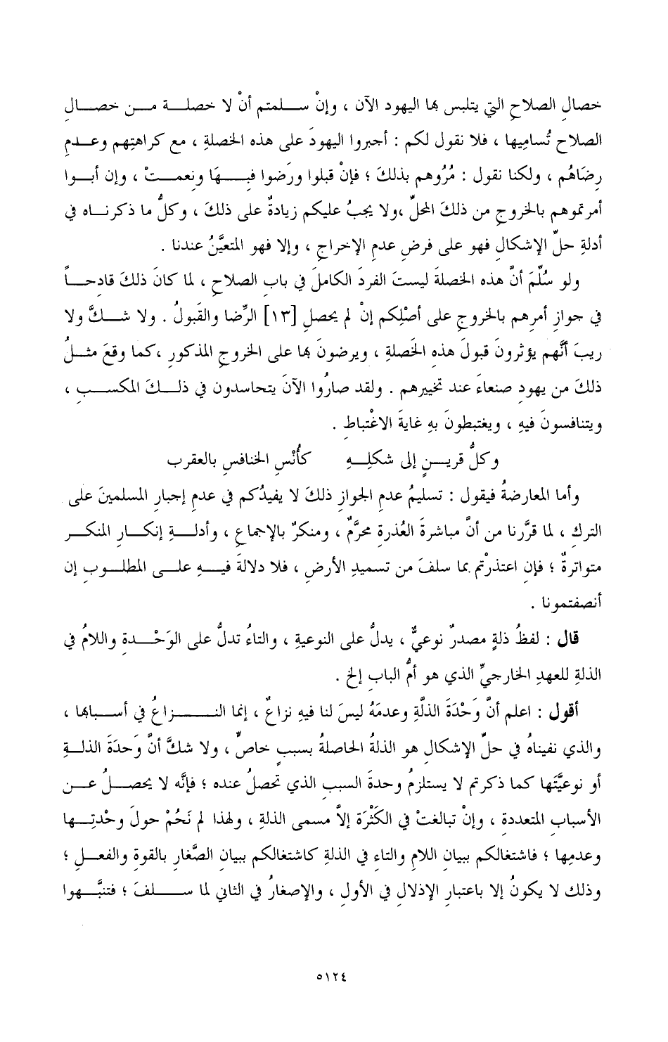أقول: اعلم أن وحدة الذلة وعدمه ليس لنا فيه نزاع، إنما النزاع في أسبابها، والذي نفيناه في حل الإشكال هو الذلة الحاصلة بسبب خاص، ولا شك أن وحدة الذلة أو نوعيتها كما ذكرتم لا يستلزم وحدة السبب الذي تحصل عنده؛ فإنه لا يحصل عن الأسباب المتعددة، وإن تبالغت في الكثرة إلا مسمى الذلة، ولهذا لم نحم حول وحدتها وعدمها؛ فاشتغالكم ببيان اللام والتاء في الذلة كاشتغالكم ببيان الصغار بالقوة والفعل؛ وذلك لا يكون إلا باعتبار الإذلال في الأول، والإصغار في الثاني لما سلف، فتنبهوا