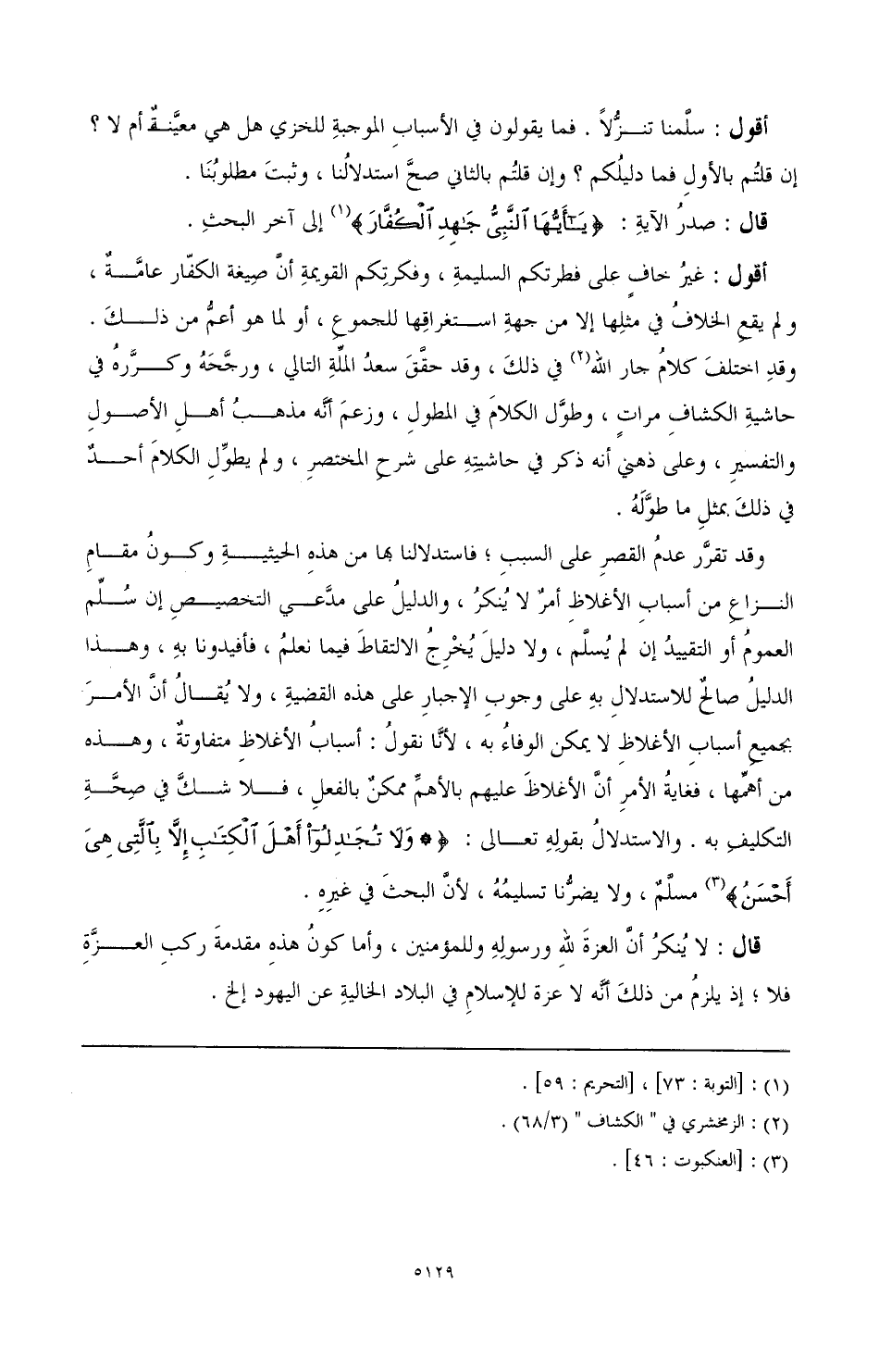 وقد تقرر عدم القصر على السبب؛ فاستدلالنا بها من هذه الحيثية وكون مقام النزاع من أسباب الأغلاظ أمر لا ينكر، والدليل على مدعي التخصيص إن سلم العموم أو التقييد إن لم يسلم، ولا دليل يخرج الالتقاط فيما نعلم، فأفيدونا به، وهذا الدليل صالح للاستدلال به على وجوب الإجبار على هذه القضية، ولا يقال أن الأمر بجميع أسباب الأغلاظ لا يمكن الوفاء به؛ لأنا نقول: أسباب الأغلاظ متفاوتة، وهذه من أهمها، فغاية الأمر أن الأغلاظ عليهم بالأهم ممكن بالفعل، فلا شك في صحة التكليف به. والاستدلال بقوله تعالى: {ولا تجادلوا أهل الكتاب إلا بالتي هي أحسن} (¬3) مسلم، ولا يضرنا تسليمه؛ لأن البحث في غيره.