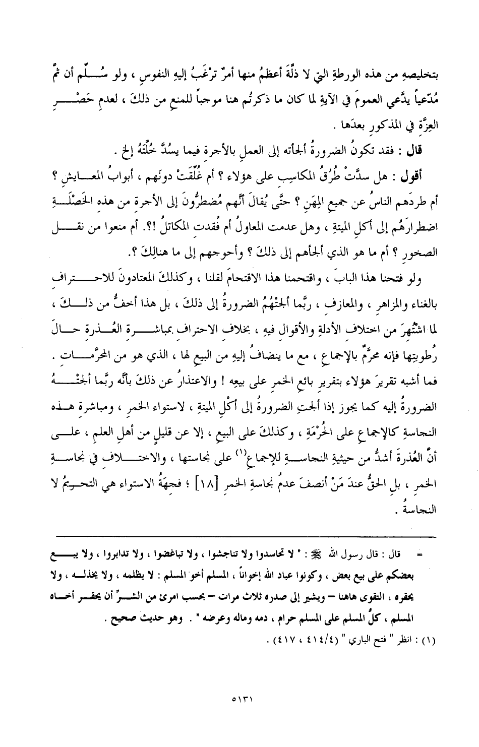ولو فتحنا هذه الباب، واقتحمنا هذا الاقتحام لقلنا، وكذلك المعتادون للاحتراف بالغناء والمزاهر، والمعازف، ربما ألجتهم الضرورة إلى ذلك، بل هذا أخف من ذلك، لما اشتهر من اختلاف الأدلة والأقوال فيه، بخلاف الاحتراف بمباشرة العذرة حال رطوبتها فإنه محرم بالإجماع، مع ما ينضاف إليه من البيع لها، الذي هو من المحرمات. فما أشبه تقرير هؤلاء بتقرير بائع الخمر على بيعه! والاعتذار عن ذلك بأنه ربما ألجته الضرورة إليه كما يجوز إذا ألجت الضرورة إلى أكل الميتة، لاستواء الخمر، ومباشرة هذه النجاسة كالإجماع على الحرمة، وكذلك على البيع، إلا عن قليل من أهل العلم، على أن العذرة أشد من حيثية النجاسة للإجماع (¬1) على نجاستها، والاختلاف في نجاسة الخمر، بل الحق عند من أنصف عدم نجاسة الخمر [18]؛ فجهة الاستواء هي التحريم لا النجاسة.
