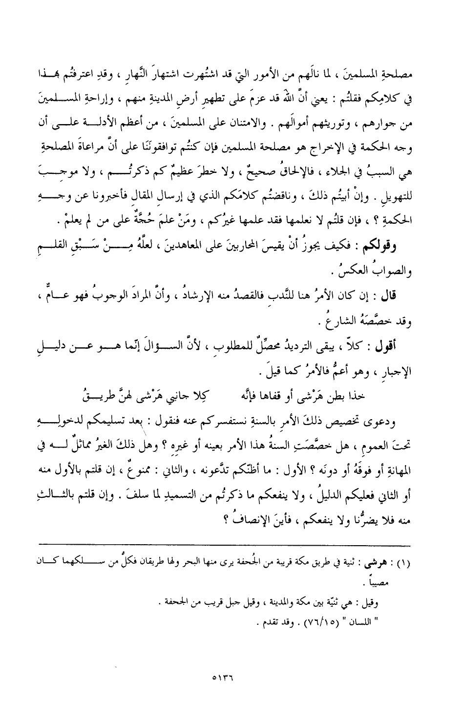 مصلحة المسلمين، لما نالهم من الأمور التي قد اشتهرت اشتهار النهار، وقد اعترفتم بهذا في كلامكم فقلتم: يعني أن الله قد عزم على تطهير أرض المدينة منهم، وإراحة المسلمين من جوارهم، وتوريثهم أموالهم. والامتنان على المسلمين، من أعظم الأدلة على أن وجه الحكمة في الإخراج هو مصلحة المسلمين فإن كنتم توافقوننا على أن مراعاة المصلحة هي السبب في الجلاء، فالإلحاق صحيح، ولا خطر عظيم كم ذكرتم، ولا موجب للتهويل. وإن أبيتم ذلك، وناقضتم كلامكم الذي في إرسال المقال فأخبرونا عن وجه الحكمة؟، فإن قلتم لا نعلمها فقد علمها غيركم، ومن علم حجة على من لم يعلم.