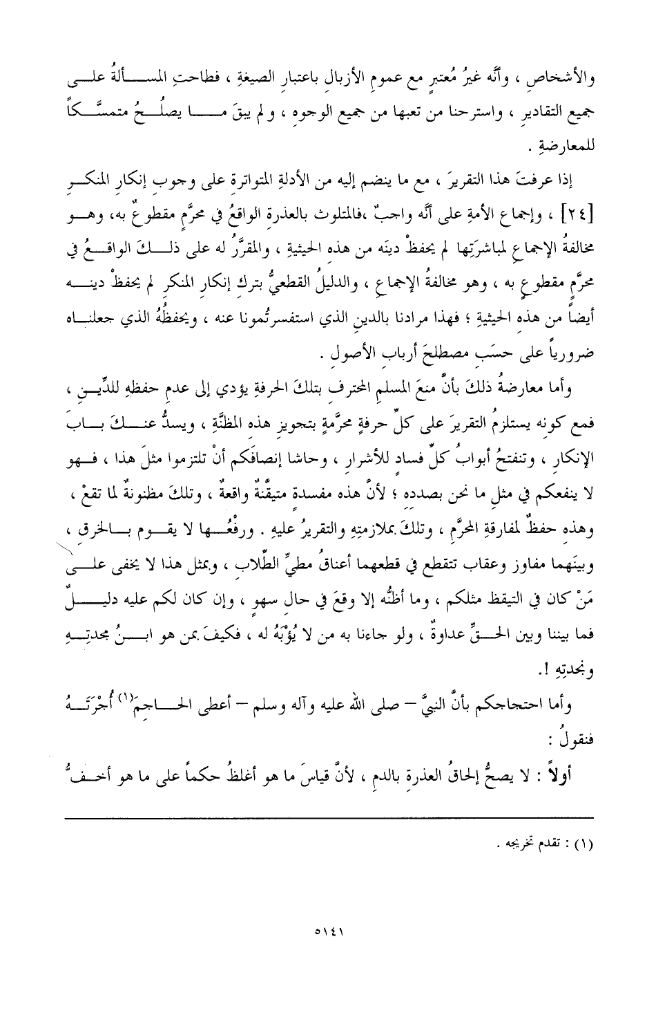 إذا عرفت هذا التقرير، مع ما ينضم إليه من الأدلة المتواترة على وجوب إنكار المنكر [24]، وإجماع الأمة على أنه واجب، فالمتلوث بالعذرة الواقع في محرم مقطوع به، وهو مخالفة الإجماع لمباشرتها لم يحفظ دينه من هذه الحيثية، والمقرر له على ذلك الواقع في محرم مقطوع به، وهو مخالفة الإجماع، والدليل القطعي بترك إنكار المنكر لم يحفظ دينه أيضًا من هذه الحيثية؛ فهذا مرادنا بالدين الذي استفسرتمونا عنه، ويحفظه الذي جعلناه ضروريًّا على حسب مصطلح أرباب الأصول.