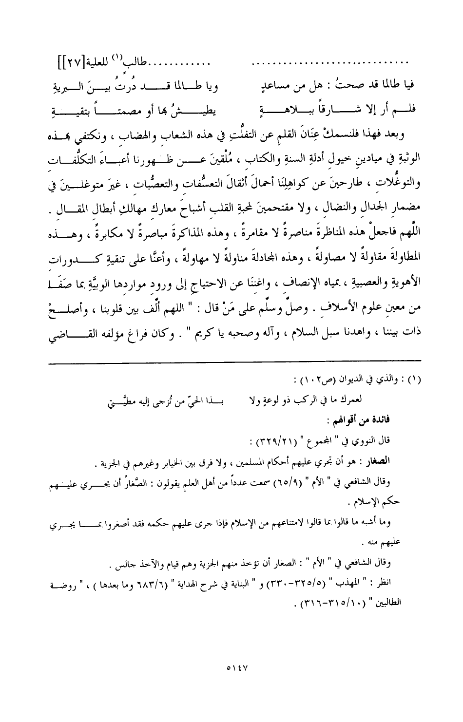 وبعد فهذا فلنسمك عنان القلم عن التفلت في هذه الشعاب والهضاب، ونكتفي بهذه الوثبة في ميادين خيول أدلة السنة والكتاب، ملقين عن ظهورنا أعباء التكلفات والتوغلات، طارحين عن كواهلنا أحمال أثقال التعسفات والتعصبات، غير متوغلين في مضمار الجدال والنضال، ولا مقتحمين لمحبة القلب أشباح معارك مهالك أبطال المقال. اللهم فاجعل هذه المناظرة مناصرة لا مقامرة، وهذه المذاكرة مباصرة لا مكابرة، وهذه المطاولة مقاولة لا مصاولة، وهذه المجادلة مناولة لا مهاولة، وأعنا على تنقية كدورات الأهوية والعصبية، بمياه الإنصاف، واغننا عن الاحتياج إلى ورود مواردها الوبية بما صفا من معين علوم الأسلاف. وصل وسلم على من قال: "اللهم ألف بين قلوبنا، وأصلح ذات بيننا، واهدنا سبل السلام، وآله وصحبه يا كريم". وكان فراغ مؤلفه القاضي