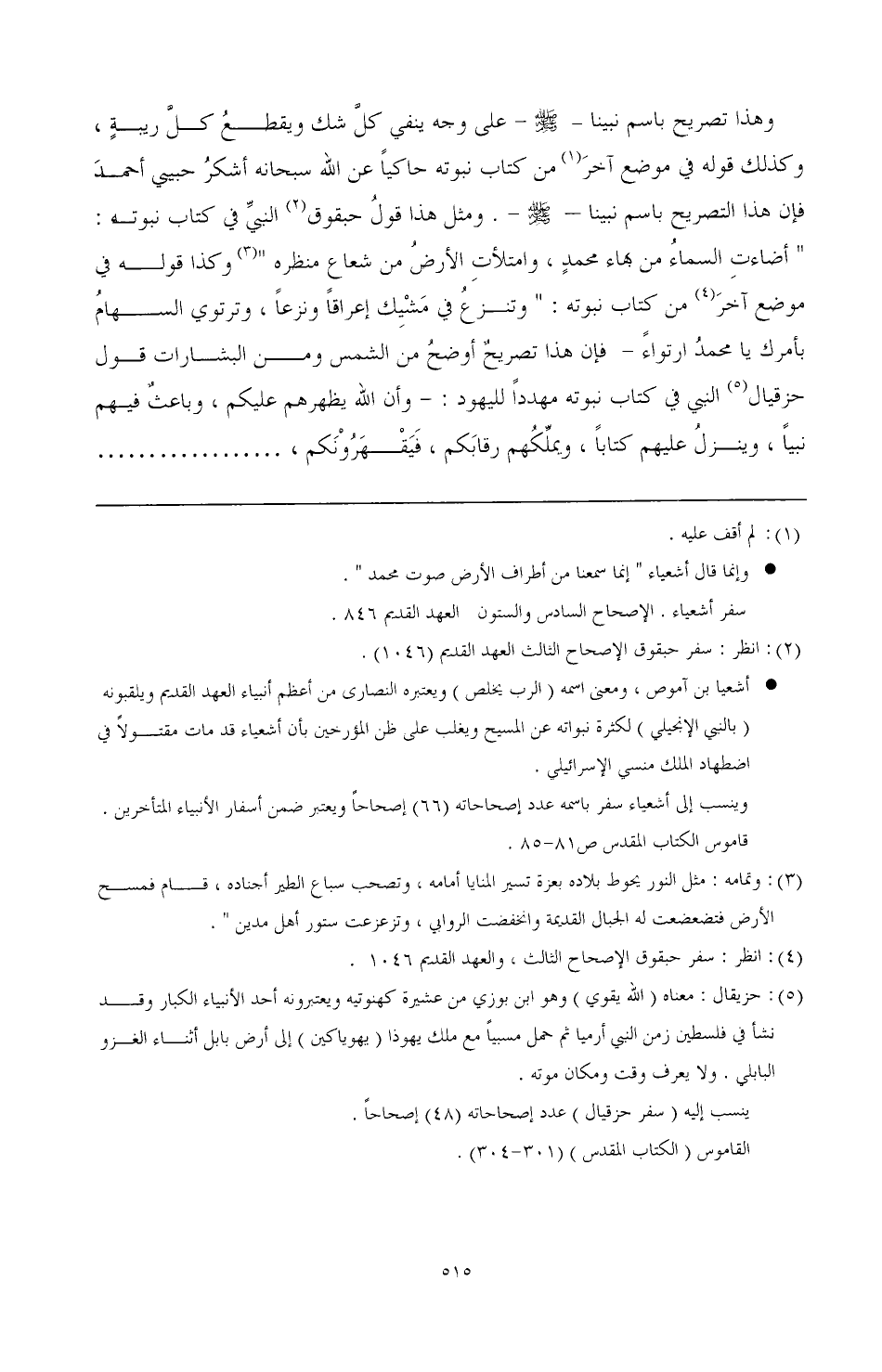وهذا تصريح باسم نبينا -صَلَّى اللهُ عَلَيْهِ وَسَلَّمَ- على وجه ينفي كل شك ويقطع كل ريبة، وكذلك قوله في موضع آخر (¬1) من كتاب نبوته حاكيا عن الله سبحانه أشكر حبيبي أحمد فإن هذا التصريح باسم نبينا -صَلَّى اللهُ عَلَيْهِ وَسَلَّمَ-. ومثل هذا قول حبقوق (¬2) النبي في كتاب نبوته: "أضاءت السماء من بهاء محمد، وامتلأت الأرض من شعاع منظره" (¬3) وكذا قوله في موضع آخر (¬4) من كتاب نبوته: "وتنزع في مشيك إعراقا ونزعا، وترتوي السهام بأمرك يا محمد ارتواء- فإن هذا تصريح أوضح من الشمس ومن البشارات قول حزقيال (¬5) النبي في كتاب نبوته مهددا لليهود:- وأن الله يظهرهم عليكم، وباعث فيهم نبيا، وينزل عليهم كتابا، ويملكهم رقابكم، فيقهرونكم،. . . . . . . . . . . . . . . . . .