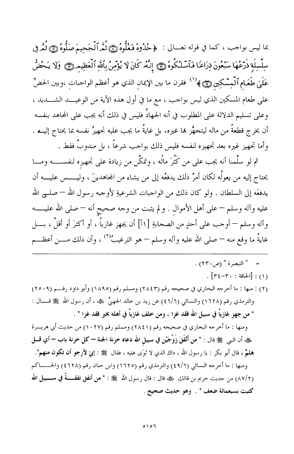 بما ليس بواجب، كما في قوله تعالى: {خُذُوهُ فَغُلُّوهُ ثُمَّ الْجَحِيمَ صَلُّوهُ ثُمَّ فِي سِلْسِلَةٍ ذَرْعُهَا سَبْعُونَ ذِرَاعًا فَاسْلُكُوهُ إِنَّهُ كَانَ لَا يُؤْمِنُ بِاللَّهِ الْعَظِيمِ وَلَا يَحُضُّ عَلَى طَعَامِ الْمِسْكِينِ} (¬1) فقرن ما بين الإيمان الذي هو أعظم الواجبات، وبين الحض على طعام المسكين الذي ليس بواجب، مع ما في أول هذه الآية من الوعيد الشديد، وعلى تسليم الدلالة على المطلوب في أنه الجهاد فليس في ذلك أنه يجب على المجاهد بنفسه أن يخرج قطعة من ماله ليتجهز بها غيره، بل غاية ما يجب عليه تجهيز نفسه بما يحتاج إليه. وأما تجهيز غيره بعد تجهيزه لنفسه فليس ذلك بواجب شرعًا، بل مندوب فقط.