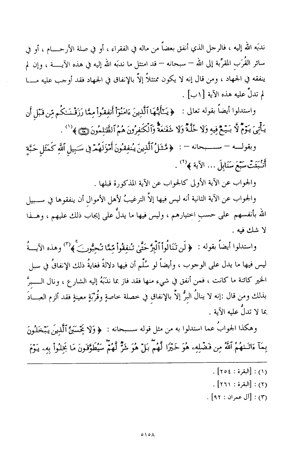 ندبه الله إليه، فالرجل الذي أنفق بعضًا من ماله في الفقراء، أو في صلة الأرحام، أو في سائر القرب المقربة إلى الله - سبحانه - قد امتثل ما ندبه الله إليه في هذه الآية، وإن لم ينفقه في الجهاد، ومن قال إنه لا يكون ممتثلًا إلا بالإنفاق في الجهاد فقد أوجب عليه ما لم تدل عليه هذه الآية [1 ب].