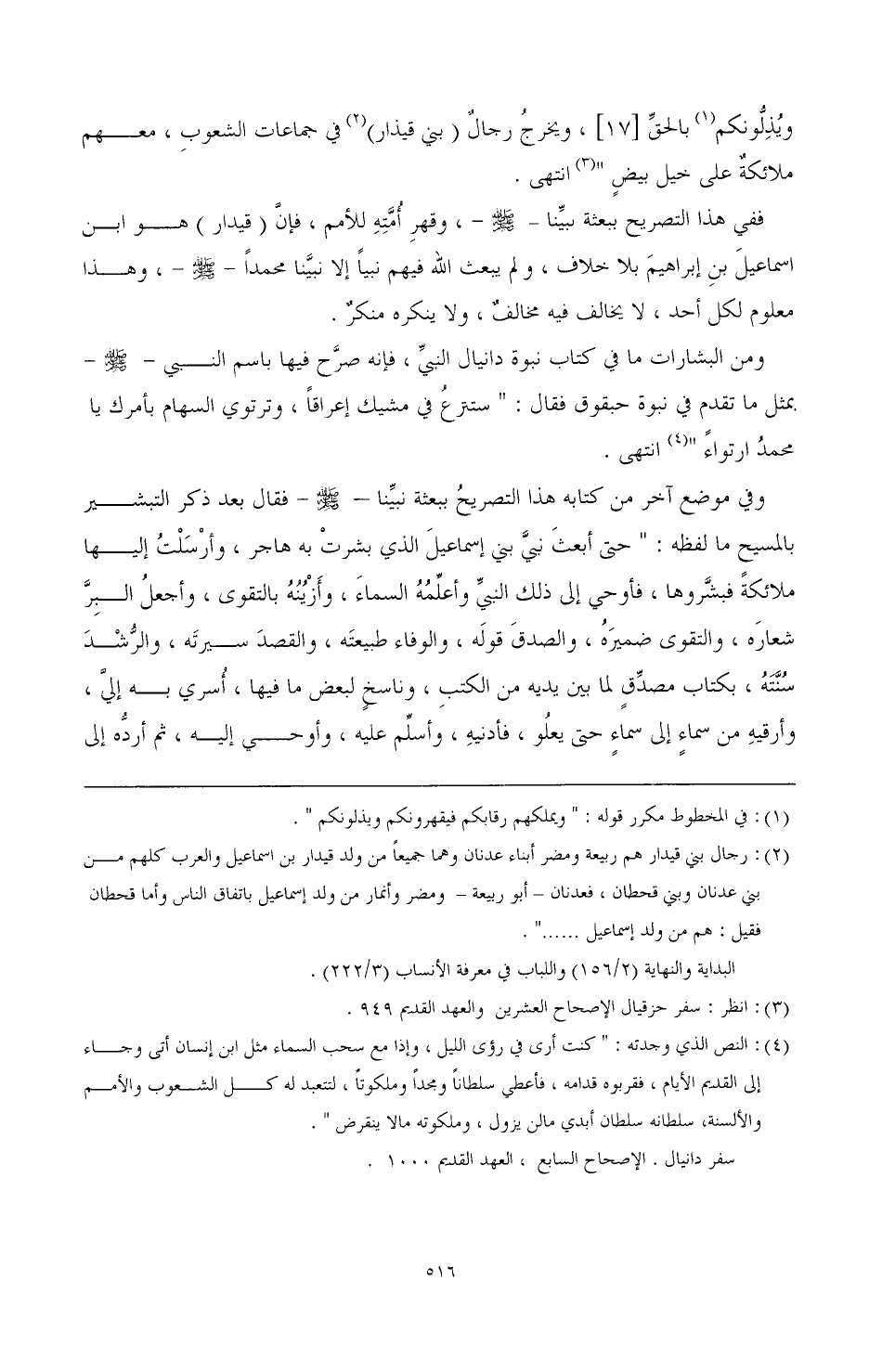 ومن البشارات ما في كتاب نبوة دانيال النبي، فإنه صرح فيها باسم النبي -صَلَّى اللهُ عَلَيْهِ وَسَلَّمَ- بمثل ما تقدم في نبوة حبقوق فقال: "ستنزع في مشيك إعراقا، وترتوي السهام بأمرك يا محمد ارتواء" (¬4) انتهى.