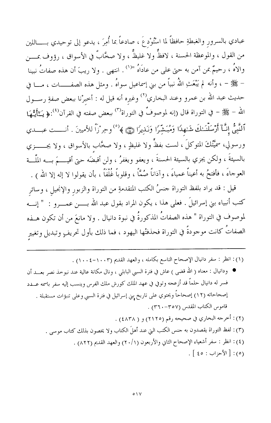 عبادي بالسرور والغبطة حافظا لما استودع، صادعا بما أمر، يدعو إلى توحيدي باللين من القول، والموعظة الحسنة، لا فظ، ولا غليظ، ولا صخاب في الأسواق، رؤوف بمن والاه، رحيم بمن آمن به حتى على من عاداه" (¬1). انتهى، ولا ريب أن هذه صفات نبينا - صَلَّى اللهُ عَلَيْهِ وَسَلَّمَ- وأنه لم يبعث الله نبيا من بني إسماعيل سواه. ومثل هذه الصفات، ما في حديث عبد الله بن عمرو وعند البخاري (¬2) وغيره أنه قيل له: أخبرنا ببعض صفة رسول الله -صَلَّى اللهُ عَلَيْهِ وَسَلَّمَ- في التوراة قال (إنه لموصوف في التوراة (¬3) ببعض صفته في القرآن (¬4):} يَا أَيُّهَا النَّبِيُّ إِنَّا أَرْسَلْنَاكَ شَاهِدًا وَمُبَشِّرًا وَنَذِيرًا {(¬5) وحرزا للأميين. أنت عبدي ورسولي، حميتك المتوكل، لست بفظ، ولا غليظ، ولا صخاب بالأسواق، ولا يجزي بالسيئة، ولكن يجزي بالسيئة الحسنة، ويعفو ويغفر، ولن أقبضه حتى أقيم به الملة العوجاء، فأفتح به أعينا عمياء، وآذانا صما، وقلوبا غلفا، بأن يقولوا لا إله إلا الله). قيل: قد يراد بلفظ التوراة جنس الكتب المتقدمة من التوراة والزبور والإنجيل، وسائر كتب أنبياء بني إسرائيل. فعلى هذا، يكون المراد بقول عبد الله بن عمرو: "إنه لموصوف في التوراة " هذه الصفات المذكورة في نبوة دانيال، ولا مانع من أن تكون هذه الصفات كانت موجودة في التوراة فحذفتها اليهود، فما ذلك بأول تحريف وتبديل وتغيير