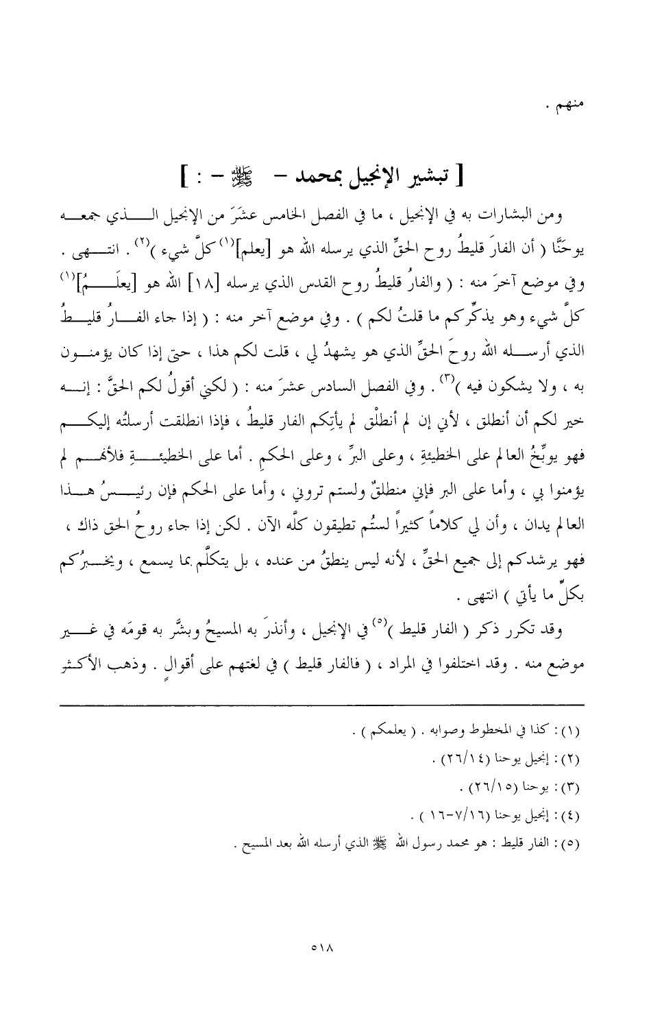 وقد تكرر ذكر (الفار قليط) (¬5) في الإنجيل، وأنذر به المسيح وبشر به قومه في غير موضع منه. وقد اختلفوا في المراد، (فالفار قليط) في لغتهم على أقوال. وذهب الأكثر
