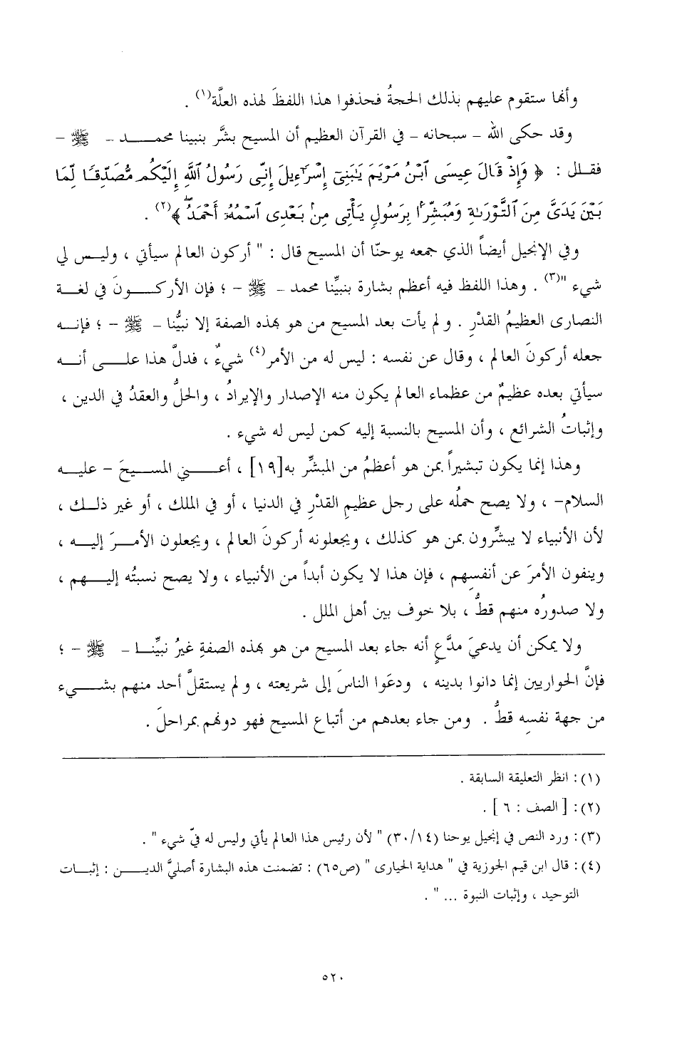 وقد حكى الله - سبحانه- في القرآن العظيم أن المسيح بشر بنبينا محمد - صَلَّى اللهُ عَلَيْهِ وَسَلَّمَ- فقال:} وَإِذْ قَالَ عِيسَى ابْنُ مَرْيَمَ يَا بَنِي إِسْرَائِيلَ إِنِّي رَسُولُ اللَّهِ إِلَيْكُمْ مُصَدِّقًا لِمَا بَيْنَ يَدَيَّ مِنَ التَّوْرَاةِ وَمُبَشِّرًا بِرَسُولٍ يَأْتِي مِنْ بَعْدِي اسْمُهُ أَحْمَدُ {(¬2).