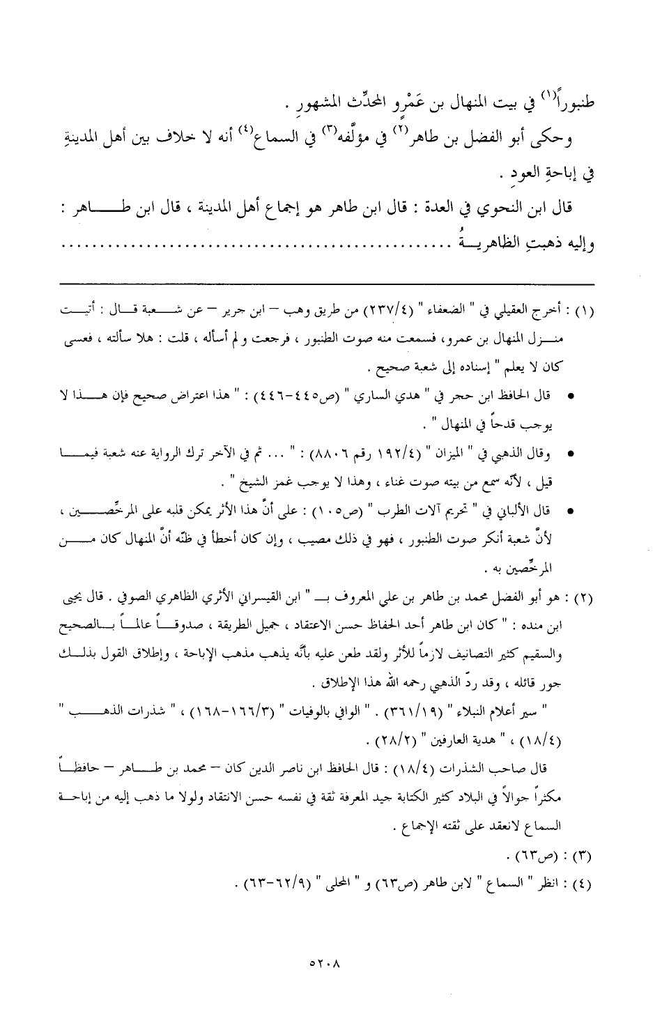 * وقال الألباني في "تحريم آلات الطرب" (ص 105): على أن هذا الأثر يمكن قلبه على المرخصين. لأن شعبة أنكر صوت الطنبور، فهو في ذلك مصيب، وإن كان أخطأ في ظنه أن المنهال كان من المرخصين به.