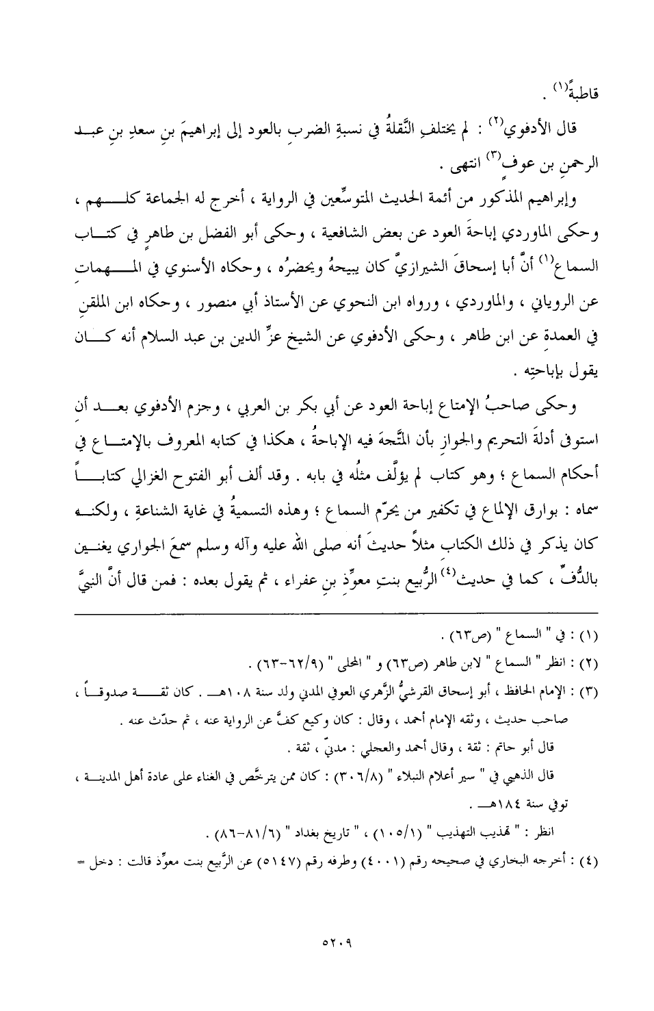 وإبراهيم المذكور من أئمة الحديث المتوسعين في الرواية، أخرج له الجماعة كلهم، وحكى الماوردي إباحة العود عن بعض الشافعية، وحكى أبو الفضل بن طاهر في كتاب السماع (¬4) أن أبا إسحاق الشيرازي كان يبيحه ويحضره، وحكاه الأسنوي في المهمات عن الروياني، والماوردي، ورواه ابن النحوي عن الأستاذ أبي منصور، وحكاه ابن الملقن في العمدة عن ابن طاهر، وحكى الأدفوي عن الشيخ عز الدين بن عبد السلام أنه كان يقول بإباحته.