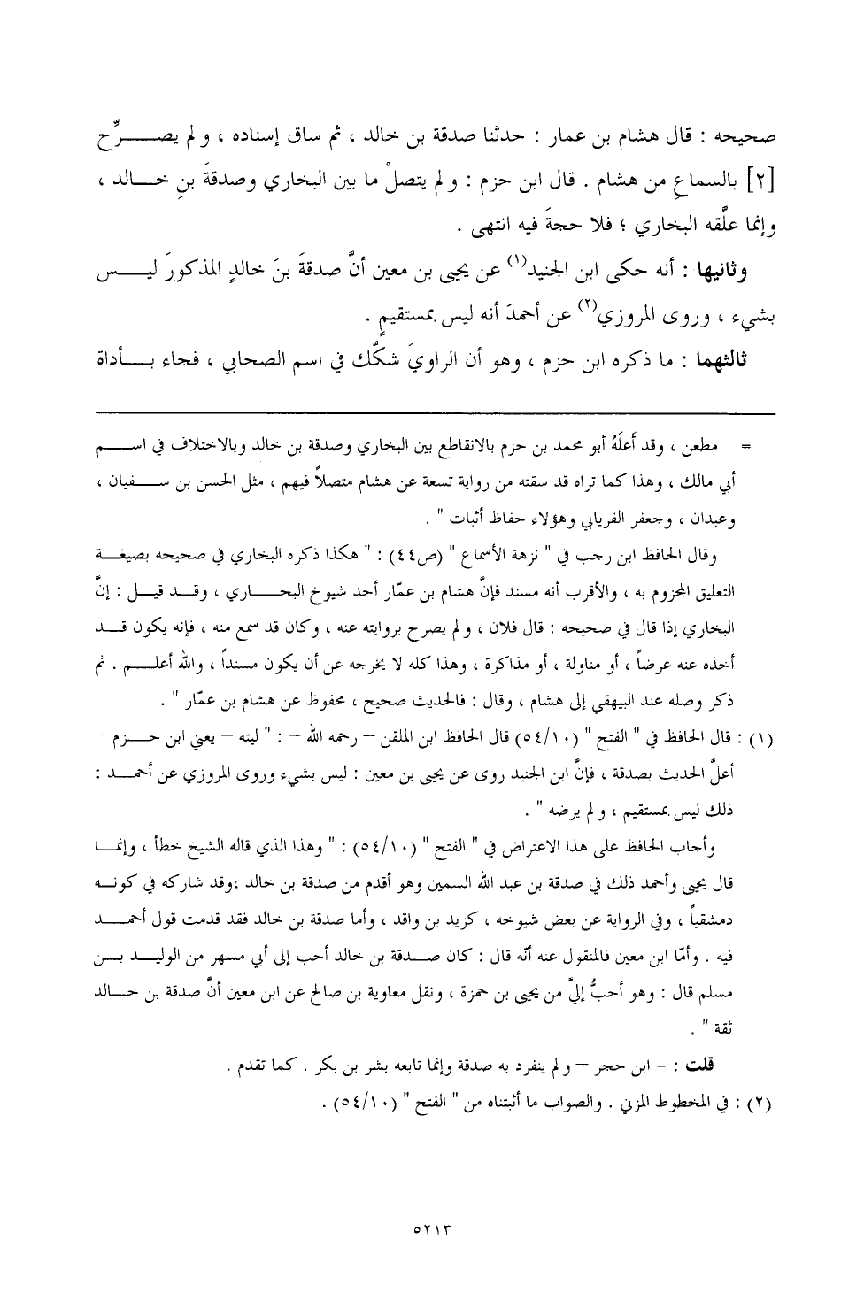 (¬1) قال الحافظ في "الفتح" (10/ 54) قال الحافظ ابن الملقن - رحمه الله -: "ليته - يعني ابن حزم - أعل الحديث بصدقة، فإن ابن الجنيد روى عن يحيى بن معين: ليس بشيء، وروى المروزي عن أحمد: ذلك ليس بمستقيم، ولم يرضه".