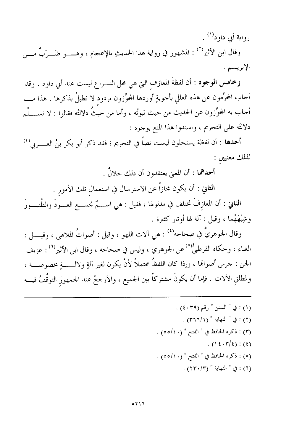 وخامس الوجوه: أن لفظة المعازف التي هي محل النزاع ليست عند أبي داود. وقد أجاب المحرمون عن هذه العلل بأجوبة أوردها المجوزون بردود لا نطيل بذكرها.