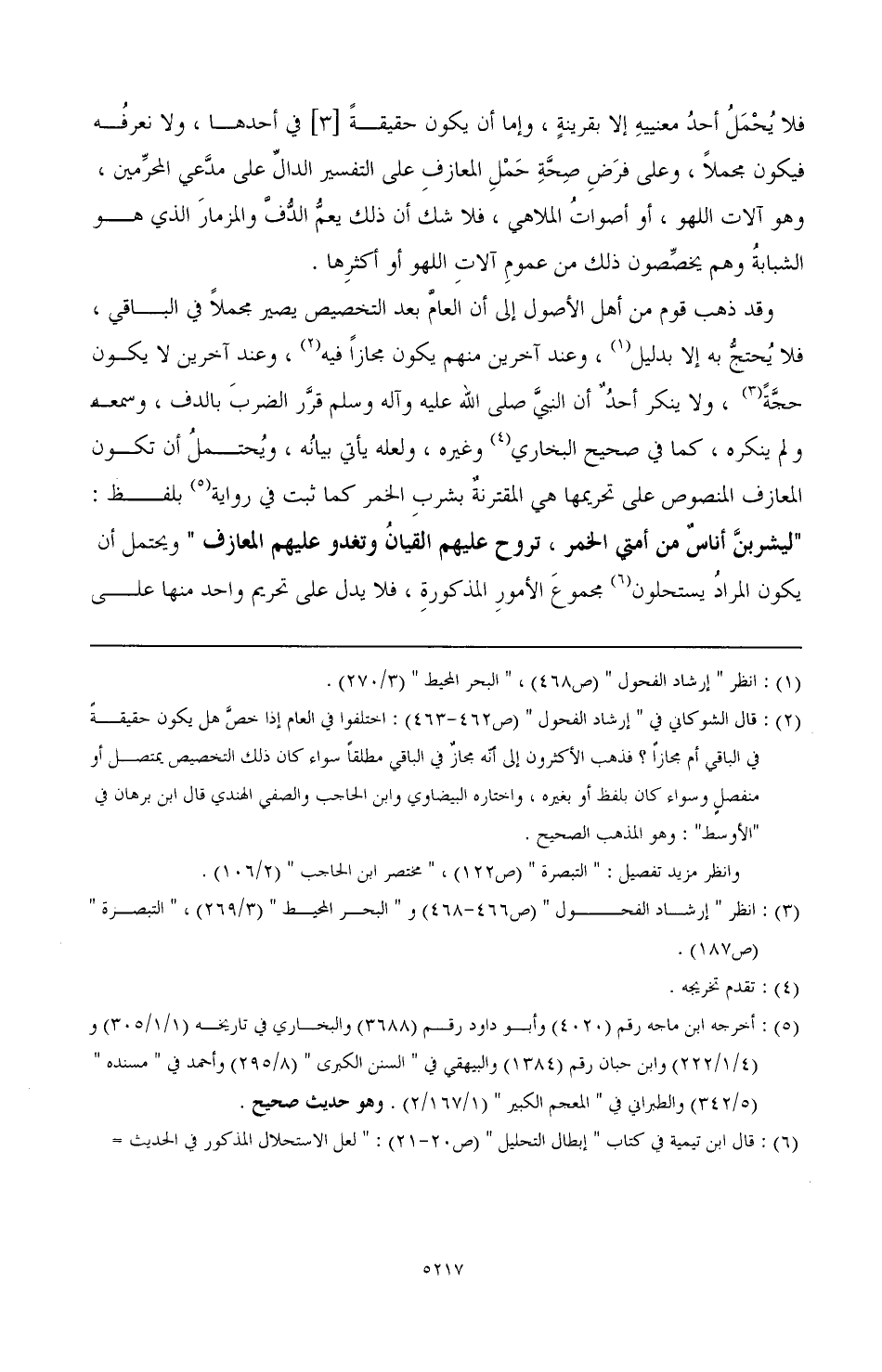 (¬6) قال ابن تيمية في كتاب "إبطال التحليل" (ص 20 - 21): "لعل الاستحلال المذكور في الحديث إنما هو بالتأويلات الفاسدة، فإنهم لو استحلوها مع اعتقاد أن الرسول صَلَّى اللهُ عَلَيْهِ وَسَلَّمَ حرمها كانوا كفارًا. ولم يكونوا من أمته، ولو كانوا معترفين بأنها حرام لأوشك أن لا يعاقبوا بالمسخ كسائر الذين لم يزالوا يفعلون هذه المعاصي، ولما قيل فيهم: " يستحلون" فإن المستحل للشيء هو الذي يأخذه معتقدًا حله. فيشبه أن يكون استحلالهم الخمر، يعني أنهم يسمونها بغير اسمها كما في الحديث، فيشربون الأشربة المحرمة، ولا يسمونها خمرًا، واستحلالهم المعازف باعتقادهم أن آلات اللهو مجرد سمع صوت فيه لذة، وهذا لا يحرم كألحان الطيور، واستحلال الحرير وسائر أنواعه باعتقادهم أنه حلال للمقاتلة، وقد سمعوا أنه مباح لبسه عند القتال عند كثير من العلماء فقاسوا سائر أحوالهم على تلك! وهذه التأويلات واقعة في الطوائف الثلاثة التي قال فيها ابن المبارك رحمه الله تعالى: