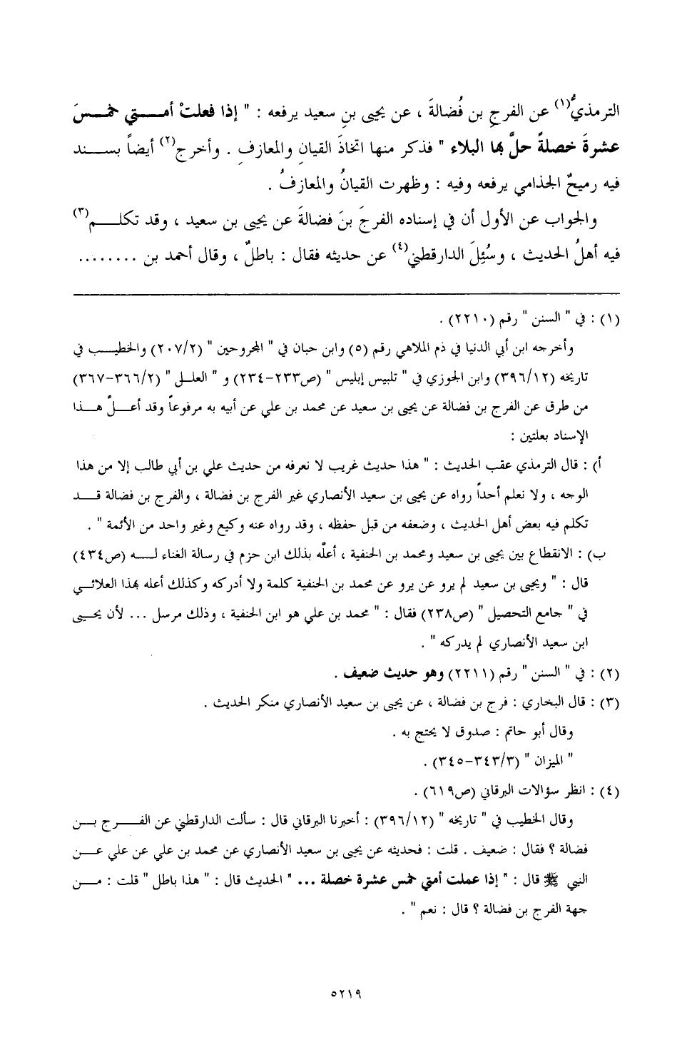 وقال الخطيب في "تاريخه" (12/ 396): أخبرنا البرقاني قال: سألت الدارقطني عن الفرج بن فضالة؟ فقال: ضعيف. قلت: فحديثه عن يحيى بن سعيد الأنصاري عن محمد بن علي عن علي عن النبي صَلَّى اللهُ عَلَيْهِ وَسَلَّمَ قال: "إذا عملت أمتي خمس عشرة خصلة ... " الحديث قال: "هذا باطل" قلت: من جهة الفرج بن فضالة؟ قال: نعم".