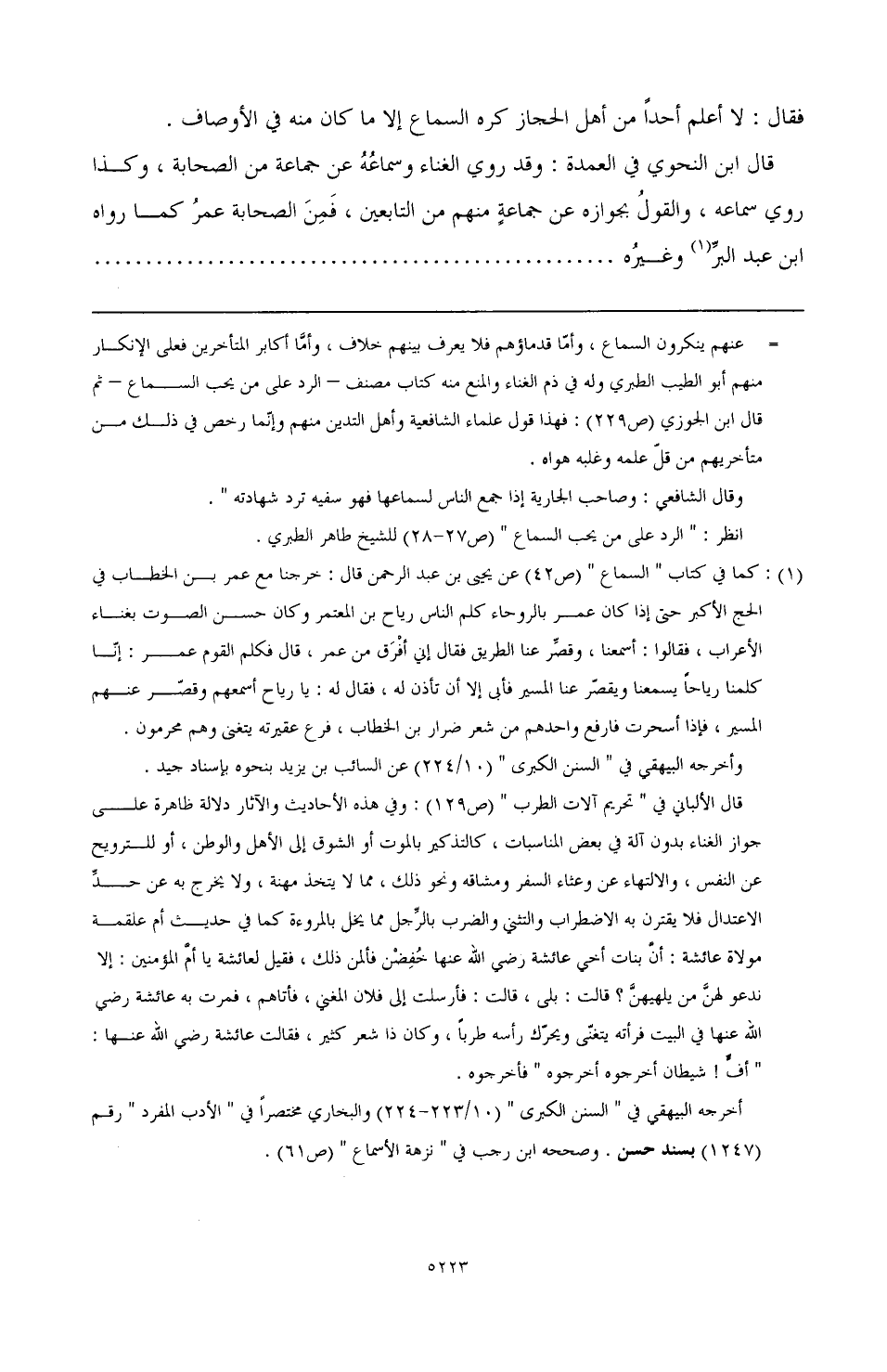 فقال: لا أعلم أحدًا من أهل الحجاز كره السماع إلا ما كان منه في الأوصاف.