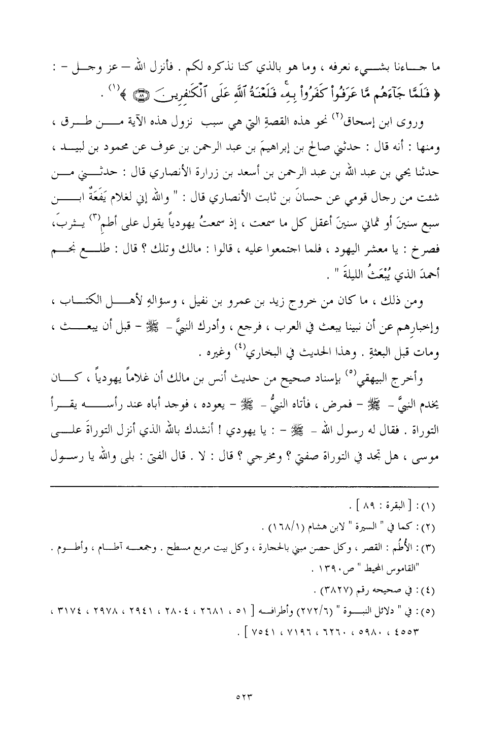 وأخرج البيهقي (¬5) بإسناد صحيح من حديث أنس بن مالك أن غلاما يهوديا كان يخدم النبي -صَلَّى اللهُ عَلَيْهِ وَسَلَّمَ- فمرض، فأتاه النبي -صَلَّى اللهُ عَلَيْهِ وَسَلَّمَ- يعوده، فوجد أباه عند رأسه يقرأ التوراة. فقال له رسول الله -صَلَّى اللهُ عَلَيْهِ وَسَلَّمَ-: يا يهودي! أنشدك بالله الذي أنزل التوراة على موسى، هل تجد في التوراة صفتي؟ ومخرجي؟ قال: لا. قال الفتى: بلى والله يا رسول