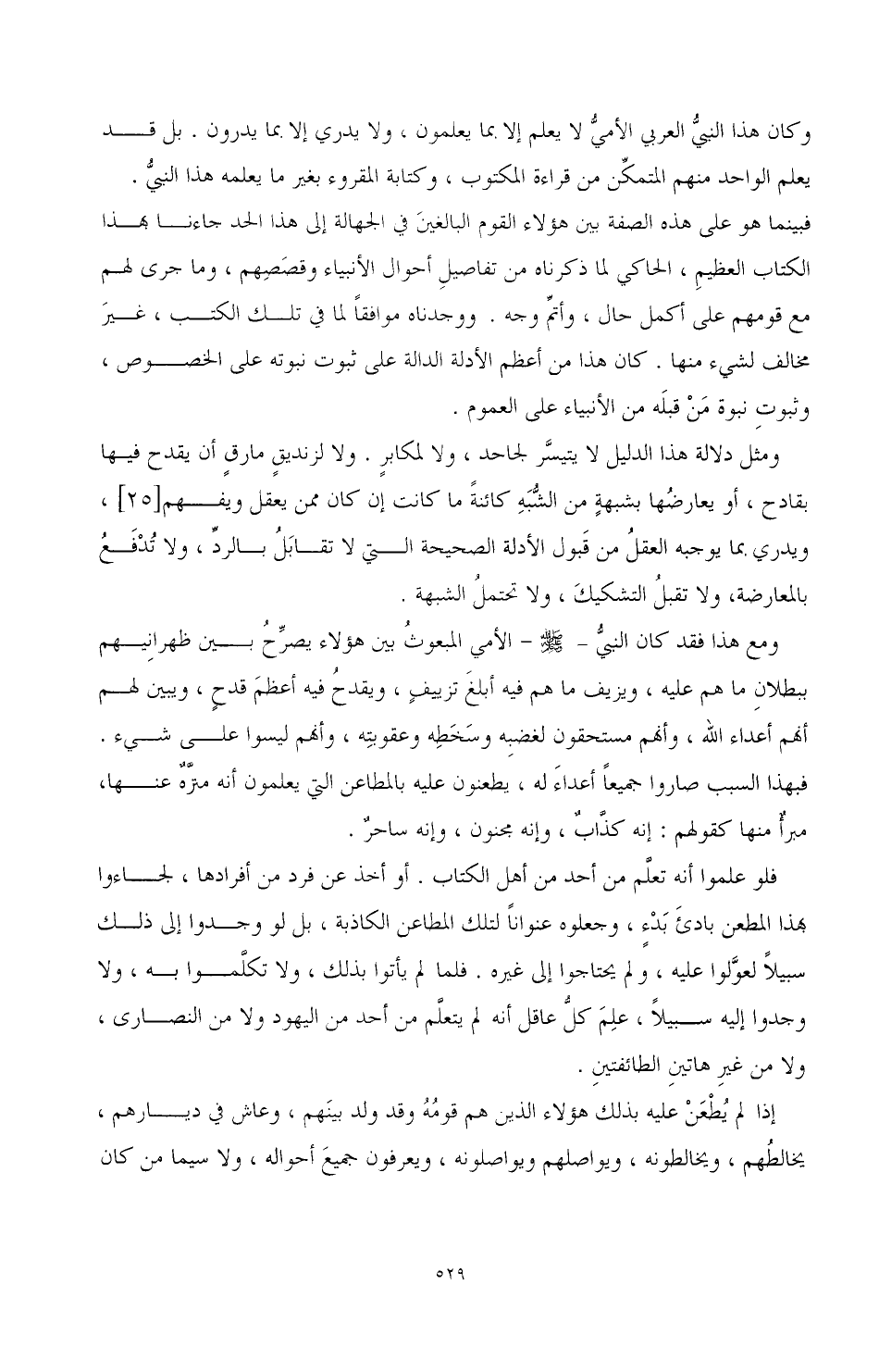 وكان هذا النبي العربي الأمي لا يعلم إلا بما يعلمون، ولا يدري إلا بما يدرون. بل قد يعلم الواحد منهم المتمكن من قراءة المكتوب، وكتابة المقروء بغير ما يعلمه هذا النبي. فبينما هو على هذه الصفة بين هؤلاء القوم البالغين في الجهالة إلى هذا الحد جاءنا هذا الكتاب العظيم، الحاكي لما ذكرناه من تفاصيل أحوال الأنبياء وقصصهم، وما جرى لهم مع قومهم على أكمل حال، وأتم وجه. ووجدناه موافقا لما في تلك الكتب، غير مخالف لشيء منها. كان هذا من أعظم الأدلة الدالة على ثبوت نبوته على الخصوص، وثبوت نبوة من قبله من الأنبياء على العموم.
