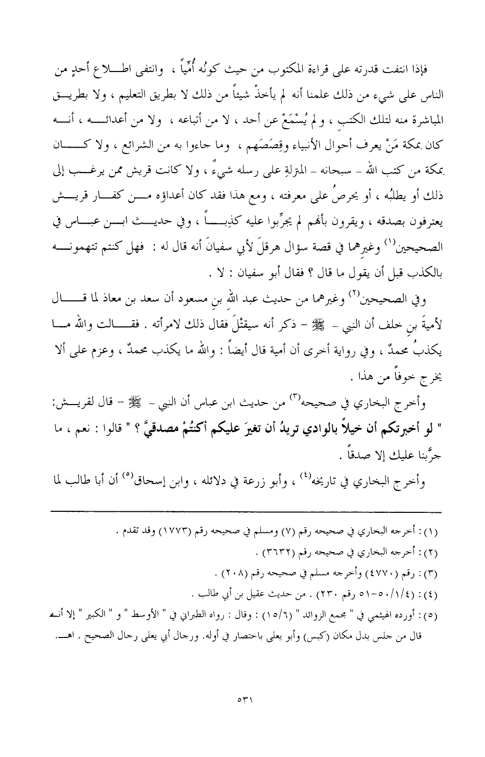 فإذا انتفت قدرته على قراءة المكتوب من حيث كونه أميا، وانتفى اطلاع أحد من الناس على شيء من ذلك علمنا أنه لم يأخذ شيئا من ذلك لا بطريق التعليم، ولا بطريق المباشرة منه لتلك الكتب، ولم يسمع عن أحد، لا من أتباعه، ولا من أعدائه، أنه كان بمكة من يعرف أحوال الأنبياء وقصصهم، وما جاءوا به من الشرائع، ولا كان بمكة من كتب الله -سبحانه- المنزلة على رسله شيء، ولا كانت قريش ممن يرغب إلى ذلك أو يطلبه، أو يحرص على معرفته، ومع هذا فقد كان أعداؤه من كفار قريش يعترفون بصدقه، ويقرون بأنهم لم يجربوا عليه كذبا، وفي حديث ابن عباس في الصحيحين (¬1) وغيرهما في قصة سؤال هرقل لأبي سفيان أنه قال له: فهل كنتم تتهمونه بالكذب قبل أن يقول ما قال؟ فقال أبو سفيان: لا.