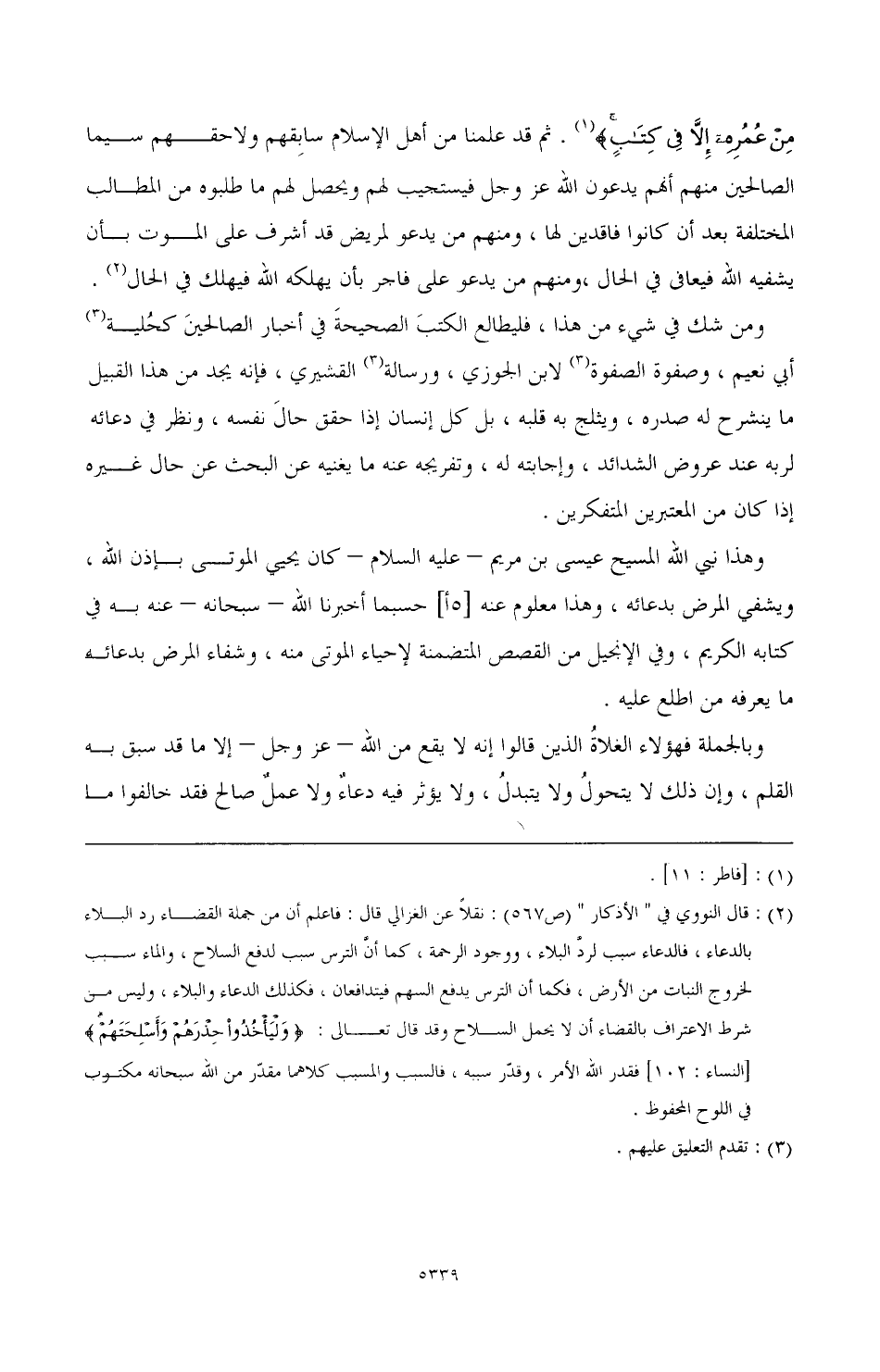 وهذا نبي الله المسيح عيسى بن مريم - عليه السلام - كان يحيي الموتى بإذن الله، ويشفي المرض بدعائه، وهذا معلوم عنه [5أ] حسبما أخبرنا الله - سبحانه - عنه به في كتابه الكريم، وفي الإنجيل من القصص المتضمنة لإحياء الموتى منه، وشفاء المرض بدعائه ما يعرفه من اطلع عليه.