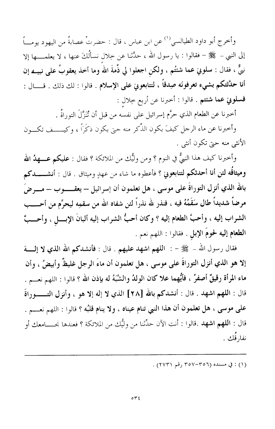 وأخرج أبو داود الطيالسي (¬1) عن ابن عباس، قال: حضرت عصابة من اليهود يوما إلى النبي -صَلَّى اللهُ عَلَيْهِ وَسَلَّمَ- فقالوا: يا رسول الله، حدثنا عن خلال نسألك عنها، لا يعلمها إلا نبي، فقال: سلوني عما شئتم، ولكن اجعلوا لي ذمة الله وما أخذ يعقوب على نبيه إن أنا حدثتكم بشيء تعرفونه صدقا، لتتابعوني على الإسلام. قالوا: لك ذلك. قال: فسلوني عما شئتم. قالوا: أخبرنا عن أربع خلال: