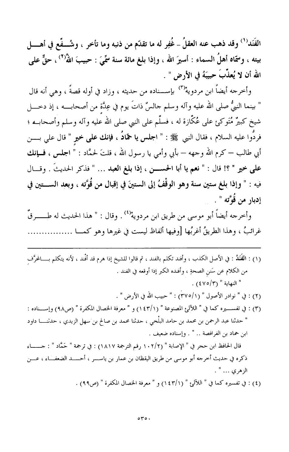 الفند (¬1) وقد ذهب عنه العقل - غفر له ما تقدم من ذنبه وما تأخر، وشفع في أهل بيته، وسماه أهل السماء: أسير الله، وإذا بلغ مائة سنة سمي: حبيب الله (¬2)، حق على الله أن لا يعذب حبيبه في الأرض".