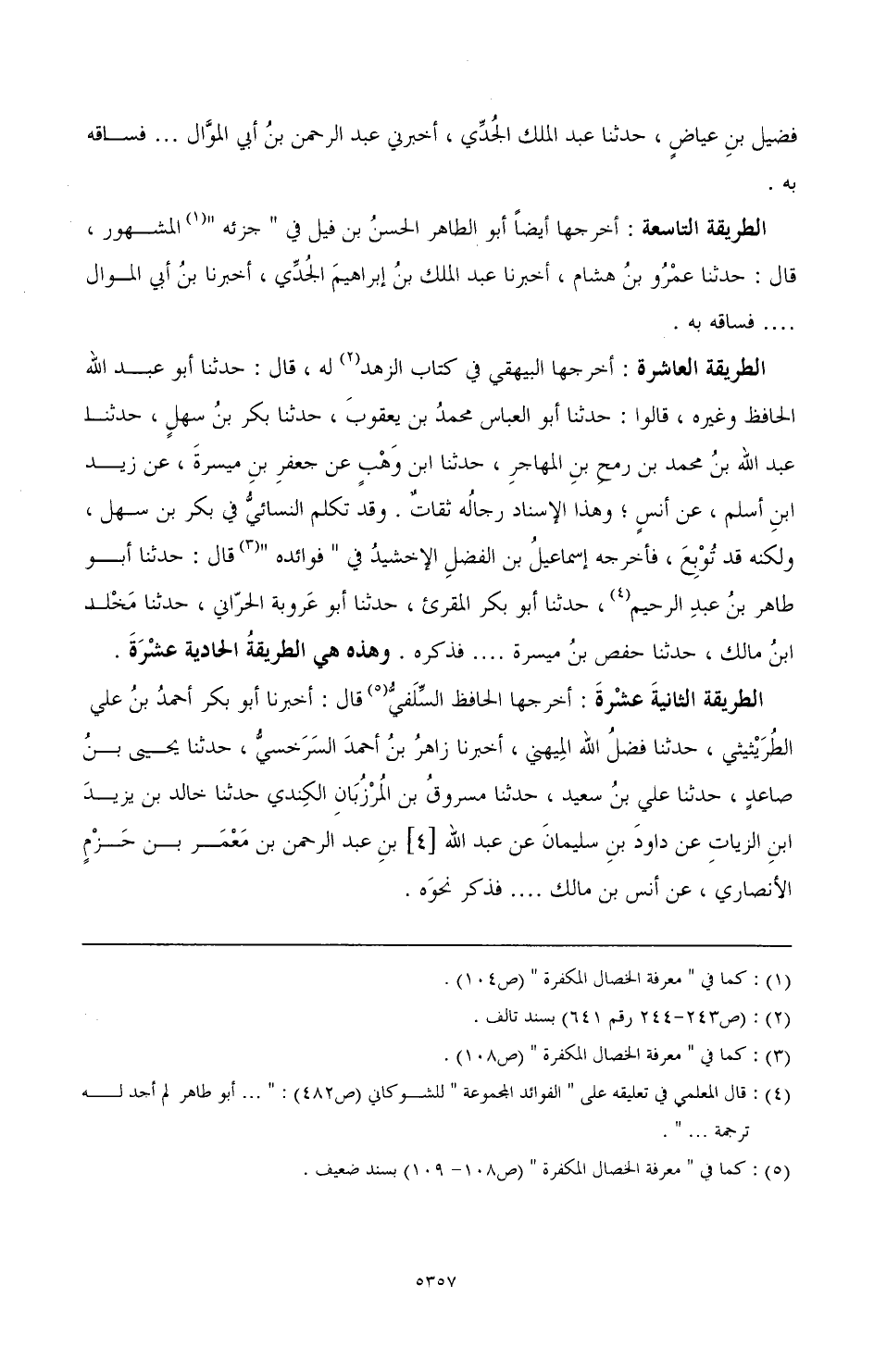 الطريقة العاشرة: أخرجها البيهقي في كتاب الزهد (¬2) له، قال: حدثنا أبو عبد الله الحافظ وغيره، قالوا: حدثنا أبو العباس محمد بن يعقوب، حدثنا بكر بن سهل، حدثنا عبد الله بن محمد بن رمح بن المهاجر، حدثنا ابن وهب عن جعفر بن ميسرة، عن زيد ابن أسلم، عن أنس؛ وهذا الإسناد رجاله ثقات. وقد تكلم النسائي في بكر بن سهل، ولكنه قد توبع، فأخرجه إسماعيل بن الفضل الإخشيد في "فوائده" (¬3) قال: حدثنا أبو طاهر بن عبد الرحيم (¬4)، حدثنا أبو بكر المقرئ، حدثنا أبو عروبة الحراني، حدثنا مخلد بن مالك، حدثنا حفص بن ميسرة ... فذكره. وهذه هي الطريقة الحادية عشرة.