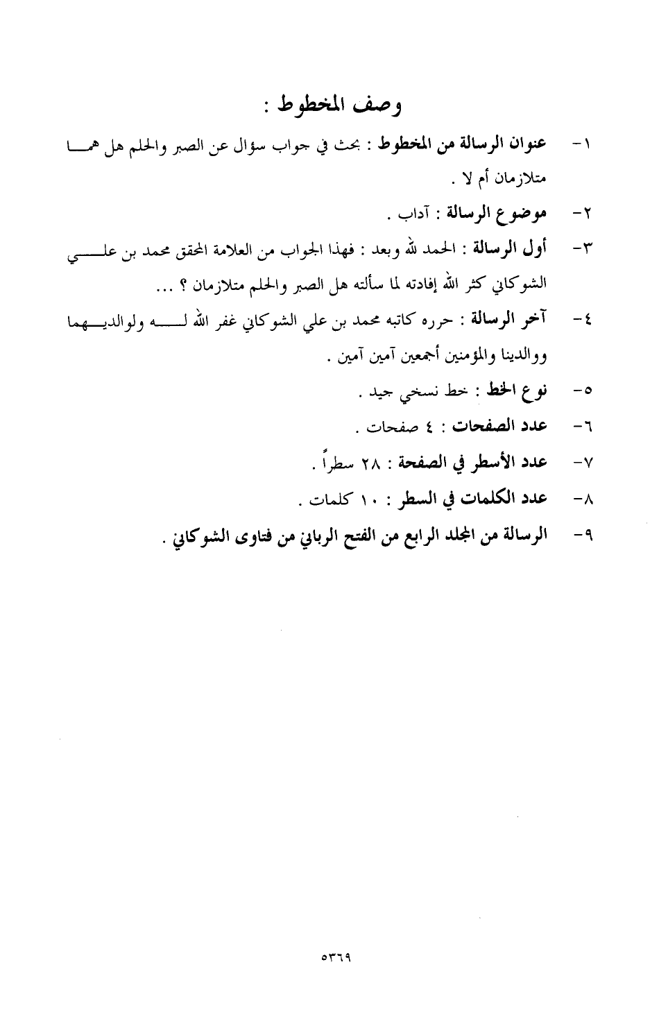 3 - أول الرسالة: الحمد لله وبعد: فهذا الجواب من العلامة المحقق محمد بن علي الشوكاني كثر الله إفادته لما سألته هل الصبر والحلم متلازمان؟
