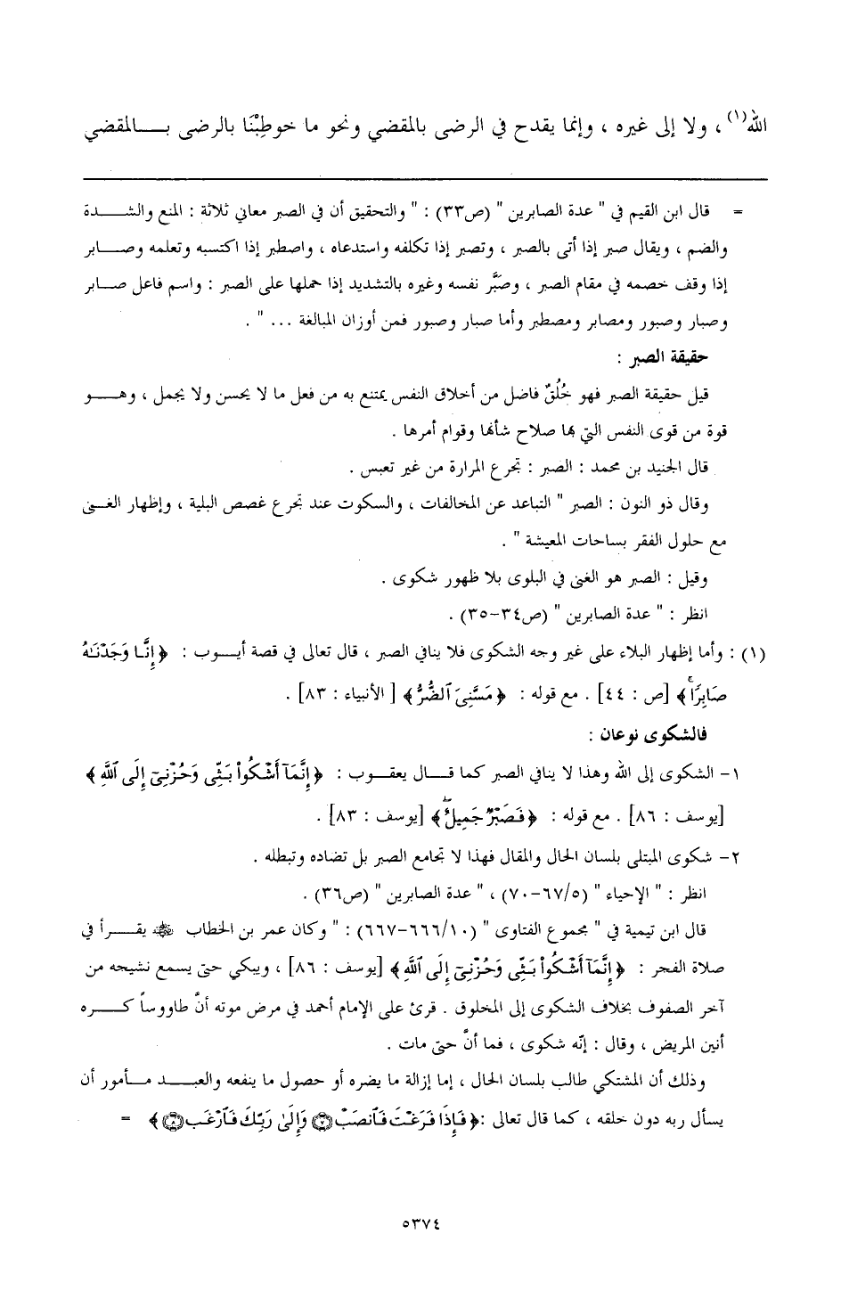 (¬1) وأما إظهار البلاء على غير وجه الشكوى فلا ينافي الصبر، قال تعالى في قصة أيوب: {إِنَّا وَجَدْنَاهُ صَابِرًا} [ص:44]. مع قوله: {مَسَّنِيَ الضُّرُّ} [الأنبياء:83].
