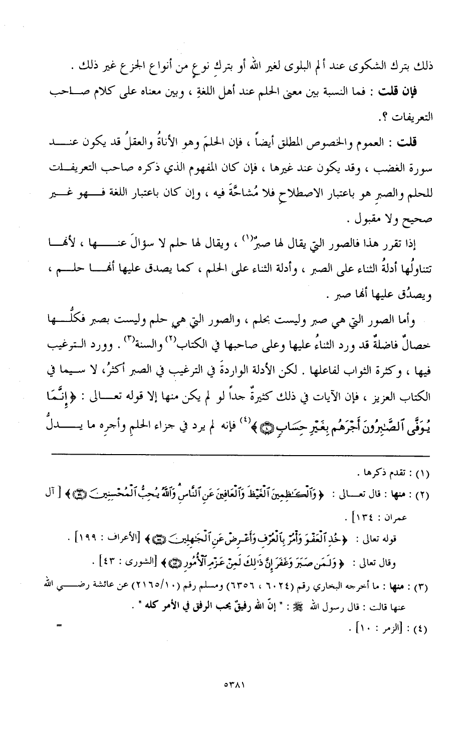 قلت: العموم والخصوص المطلق أيضا، فإن الحلم وهو الأناة والعقل قد يكون عند سورة الغضب، وقد يكون عند غيرها، فإن كان المفهوم الذي ذكره صاحب التعريفات للحلم والصبر هو باعتبار الاصطلاح فلا مشاحة فيه، وإن كان باعتبار اللغة فهو غير صحيح ولا مقبول.