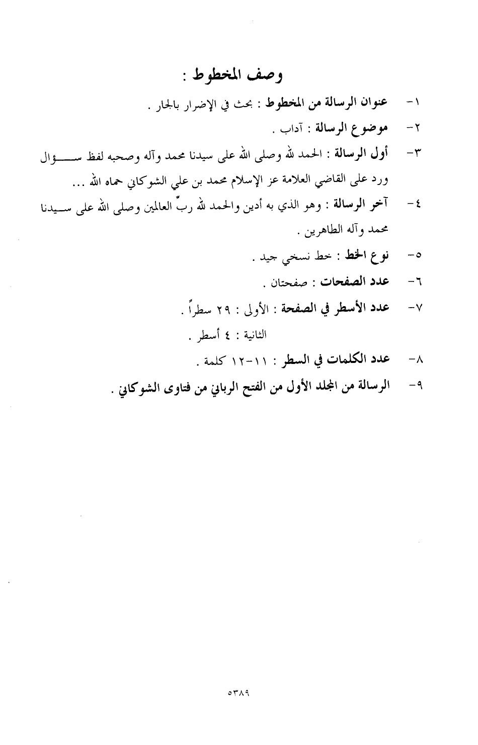 9 - الرسالة من المجلد الأول من الفتح الرباني من فتاوى الشوكاني.