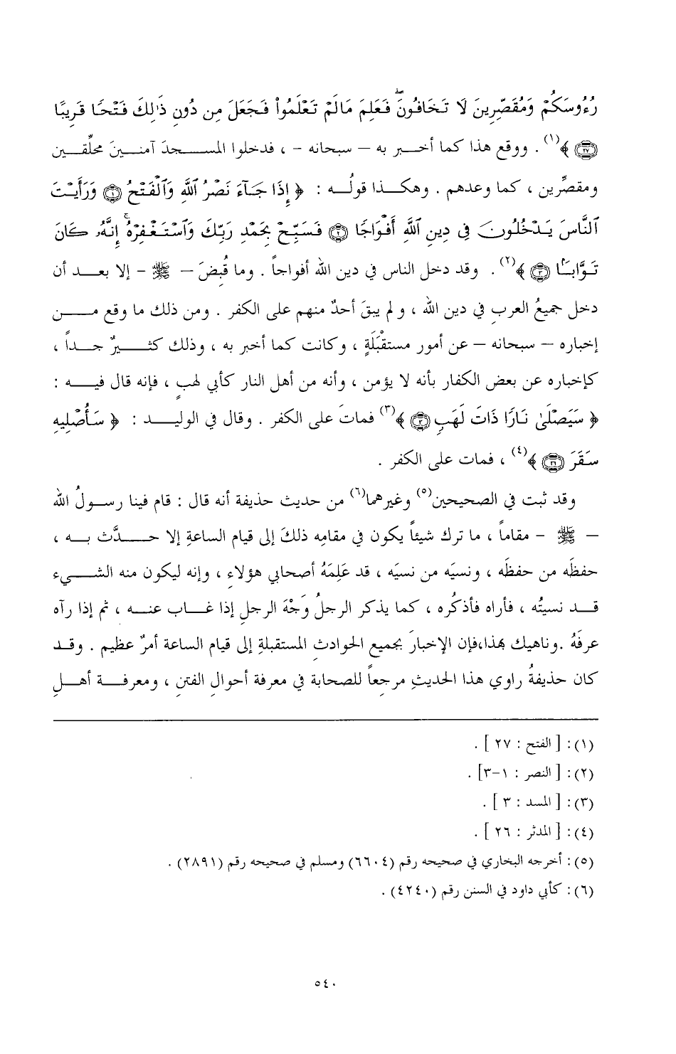 ووقع هذا كما أخبر به -سبحانه- فدخلوا المسجد آمنين محلقين ومقصرين، كما وعدهم. وهكذا قوله:} إِذَا جَاءَ نَصْرُ اللَّهِ وَالْفَتْحُ وَرَأَيْتَ النَّاسَ يَدْخُلُونَ فِي دِينِ اللَّهِ أَفْوَاجًا فَسَبِّحْ بِحَمْدِ رَبِّكَ وَاسْتَغْفِرْهُ إِنَّهُ كَانَ تَوَّابًا {(¬1) وقد دخل الناس في دين الله أفواجا. وما قبض -صَلَّى اللهُ عَلَيْهِ وَسَلَّمَ- إلا بعد أن دخل جميع العرب في دين الله، ولم يبق أحد منهم على الكفر. ومن ذلك ما وقع من إخباره- سبحانه- عن أمور مستقبلة، وكانت كما أخبر به، وذلك كثير جدا، كإخباره عن بعض الكفار بأنه لا يؤمن، وأنه من أهل النار كأبي لهب، فإنه قال فيه:} سَيَصْلَى نَارًا ذَاتَ لَهَبٍ {(¬2) فمات على الكفر. وقال في الوليد:} سَأُصْلِيهِ سَقَرَ {(¬3)، فمات على الكفر.