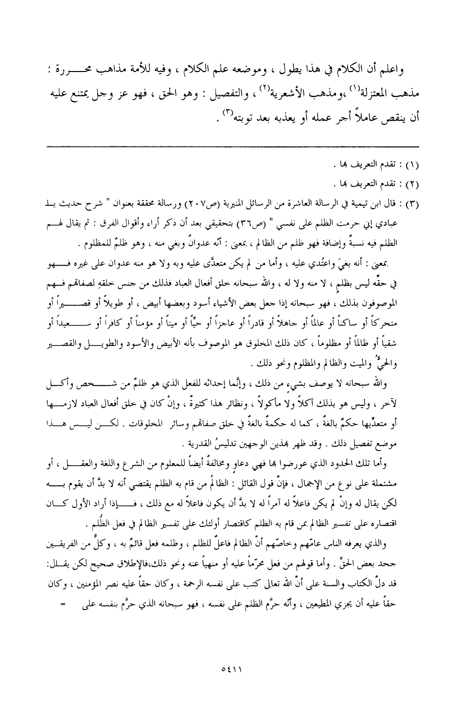 (¬3) قال ابن تيمية في الرسالة العاشرة من الرسائل المنيرية (ص207) ورسالة محققة بعنوان " شرح حديث يا عبادي إني حرمت الظلم على نفسي " (ص36) بتحقيقي بعد أن ذكر آراء، وأقوال الفرق: ثم يقال لهم الظلم فيه نسبة وإضافة فهو ظلم من الظالم، بمعنى: أنه عدوان وبغي منه، وهو ظلم للمظلوم.
