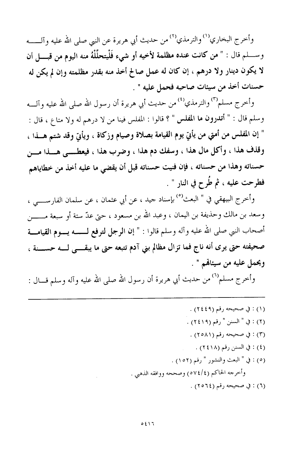 وأخرج البيهقي في " البعث (¬5) بإسناد جيد، عن أبي عثمان، عن سلمان الفارسي، وسعد بن مالك وحذيفة بن اليمان، وعبد الله بن مسعود، حتى عد ستة أو سبعة من أصحاب النبي صَلَّى اللهُ عَلَيْهِ وَآلِهِ وَسَلَّمَ قالوا: " إن الرجل لترفع له يوم القيامة صحيفته حتى يرى أنه ناج فما تزال مظالم بني آدم تتبعه حتى ما يبقى له حسنة، ويحمل عليه من سيئاتهم ".