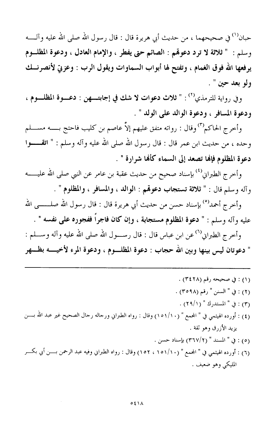 وأخرج الطبراني (¬4) بإسناد صحيح من حديث عقبة بن عامر عن النبي صَلَّى اللهُ عَلَيْهِ وَآلِهِ وَسَلَّمَ قال: " ثلاثة تستجاب دعوتهم: الوالد، والمسافر، والمظلوم ".