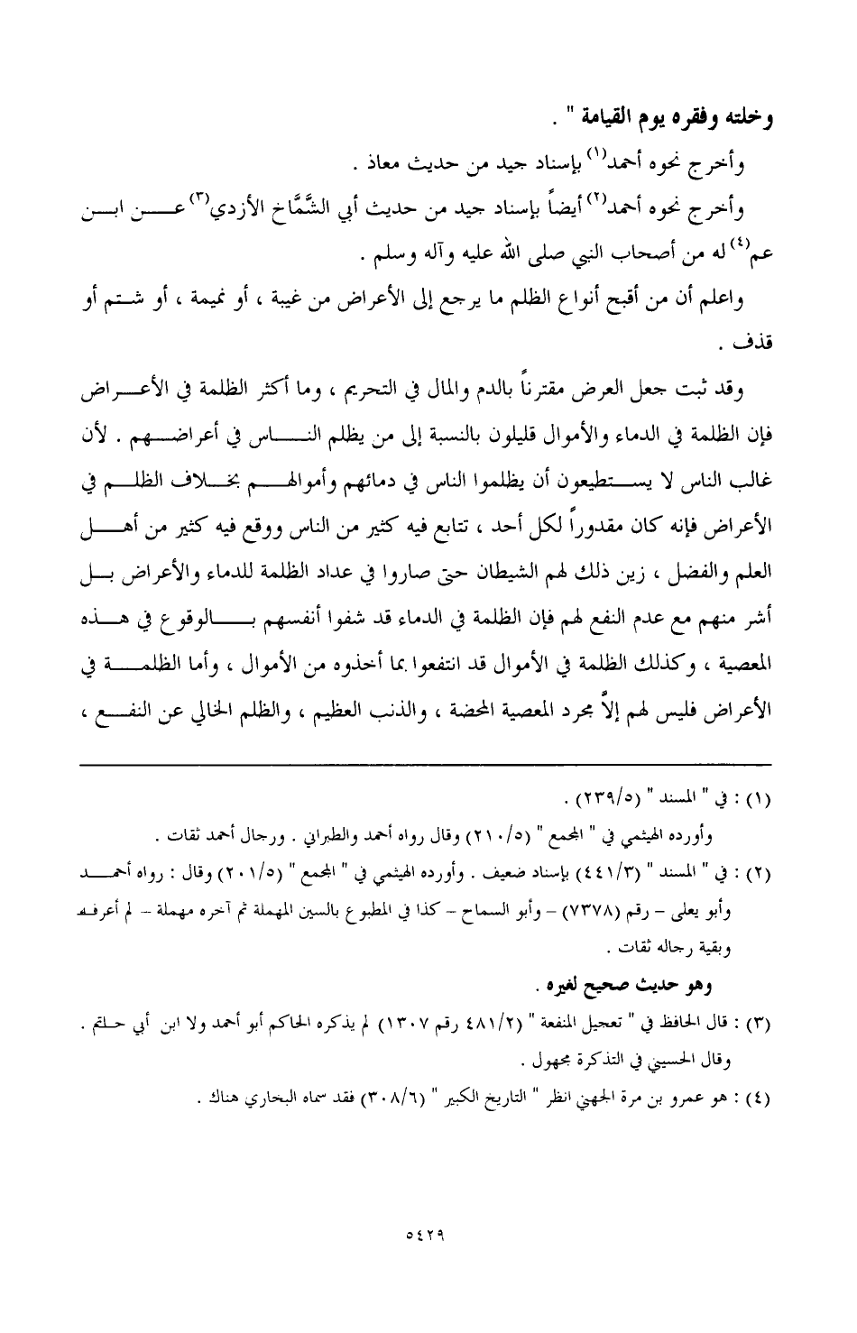وقد ثبت جعل العرض مقترنا بالدم والمال في التحريم، وما أكثر الظلمة في الأعراض فإن الظلمة في الدماء والأموال قليلون بالنسبة إلى من يظلم الناس في دمائهم وأموالهم بخلاف الظلم في الأعراض فإنه كان مقدورا لكل أحد، تتابع فيه كثير من الناس ووقع فيه كثير من أهل العلم والفضل، زين ذلك لهم الشيطان حتى صاروا في عداد الظلمة للدماء والأعراض بل أشر منهم مع عدم النفع لهم، فإن الظلمة في الدماء قد شفوا أنفسهم بالوقوع في هذه المعصية، وكذلك الظلمة في الأموال قد انتفعوا بما أخذوه من الأموال، وأما الظلمة في الأعراض فليس لهم إلا مجرد المعصية المحضة، والذنب العظيم، والظلم الخالي عن النفع،