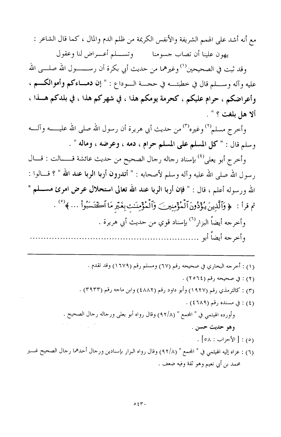 وقد ثبت في الصحيحين (¬1) وغيرهما من حديث أبي بكرة أن رسول الله صَلَّى اللهُ عَلَيْهِ وَآلِهِ وَسَلَّمَ قال في خطبته في حجة الوداع: " إن دماءكم وأموالكم، وأعراضكم، حرام عليكم، كحرمة يومكم هذا، في شهركم هذا، في بلدكم هذا، ألا هل بلغت؟ ".