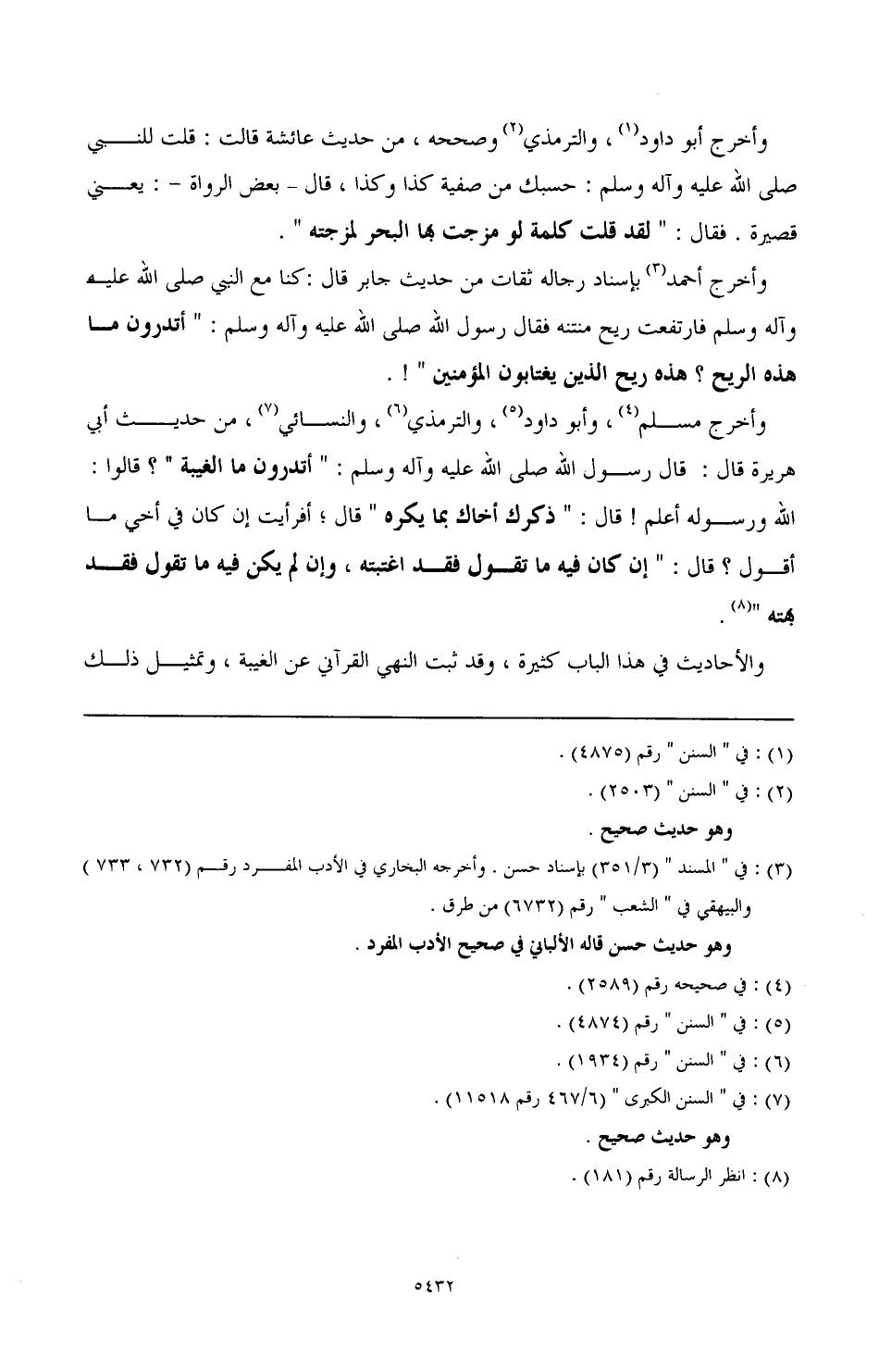 وأخرج مسلم (¬4)، وأبو داود (¬5)، والترمذي (¬6)، والنسائي (¬7)، من حيدث أبي هريرة قال: قال رسول الله صَلَّى اللهُ عَلَيْهِ وَآلِهِ وَسَلَّمَ: " أتدرون ما الغيبة "؟ قالوا: الله ورسوله أعلم! قال: " ذكرك أخاك بما يكره " قال: أفرأيت إن كان في أخي ما أقول؟ قال: " إن كان فيه ما تقول فقد اغتبته، وإن لم يكن فيه ما تقول فقد بهته " (¬8).