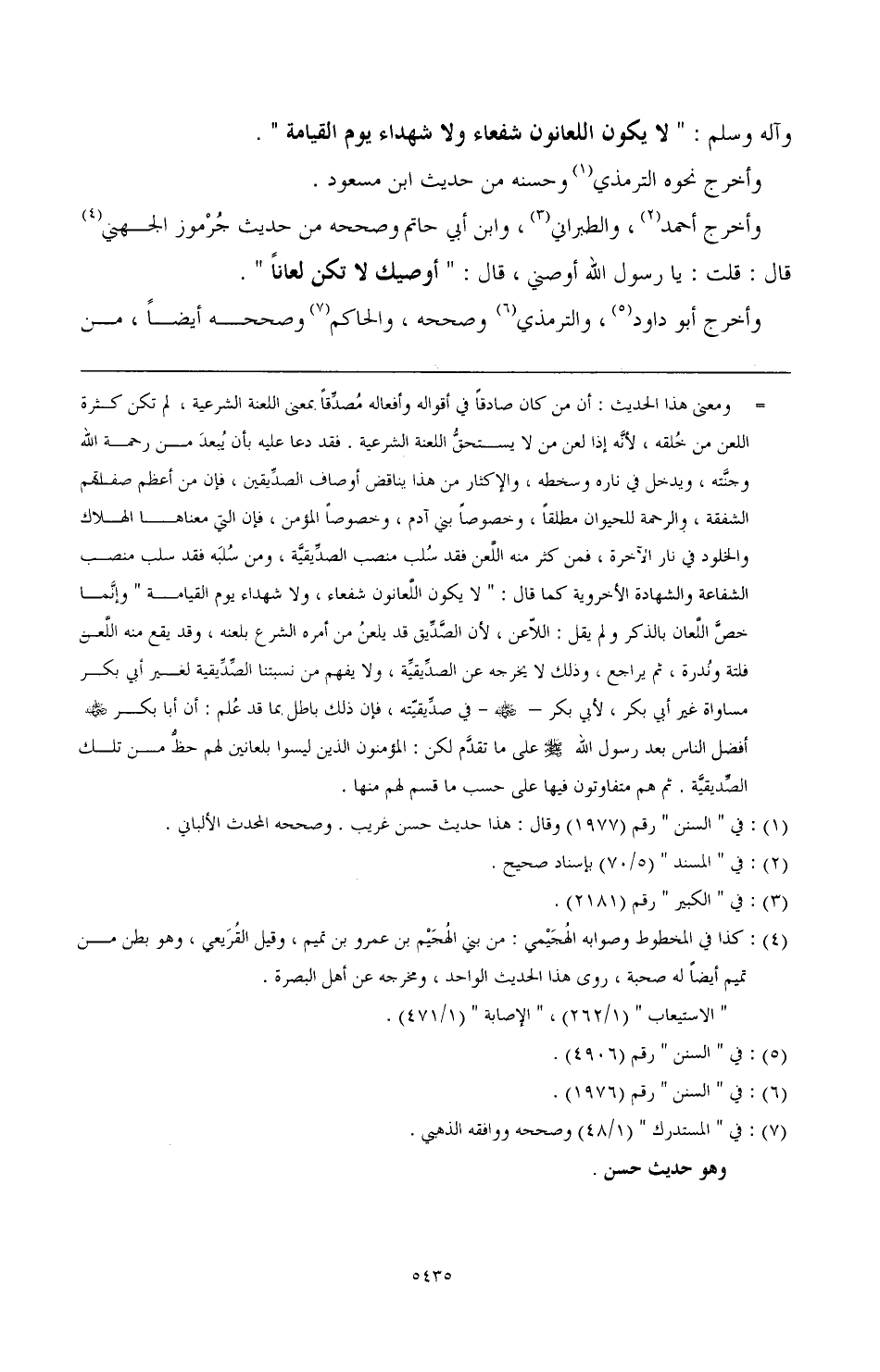 وأخرج أحمد (¬2)، والطبراني (¬3)، وابن أبي حاتم وصححه من حديث جرموز الجهني (¬4) قال: قلت: يا رسول الله أوصني، قال: " أوصيك لا تكن لعانا ".