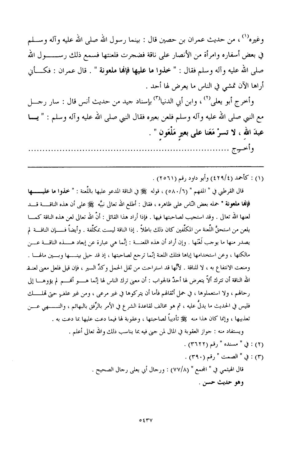 وغيره (¬1)، من حديث عمران بن حصين قال: بينما رسول الله صَلَّى اللهُ عَلَيْهِ وَآلِهِ وَسَلَّمَ في بعض أسفاره وامرأة من الأنصار على ناقة فضجرت فلعنتها، فسمع ذلك رسول الله صَلَّى اللهُ عَلَيْهِ وَآلِهِ وَسَلَّمَ فقال: " خذوا ما عليها فإنها ملعونة ". قال عمران: فكأني أراها الآن تمشي في الناس ما يعرض لها أحد.