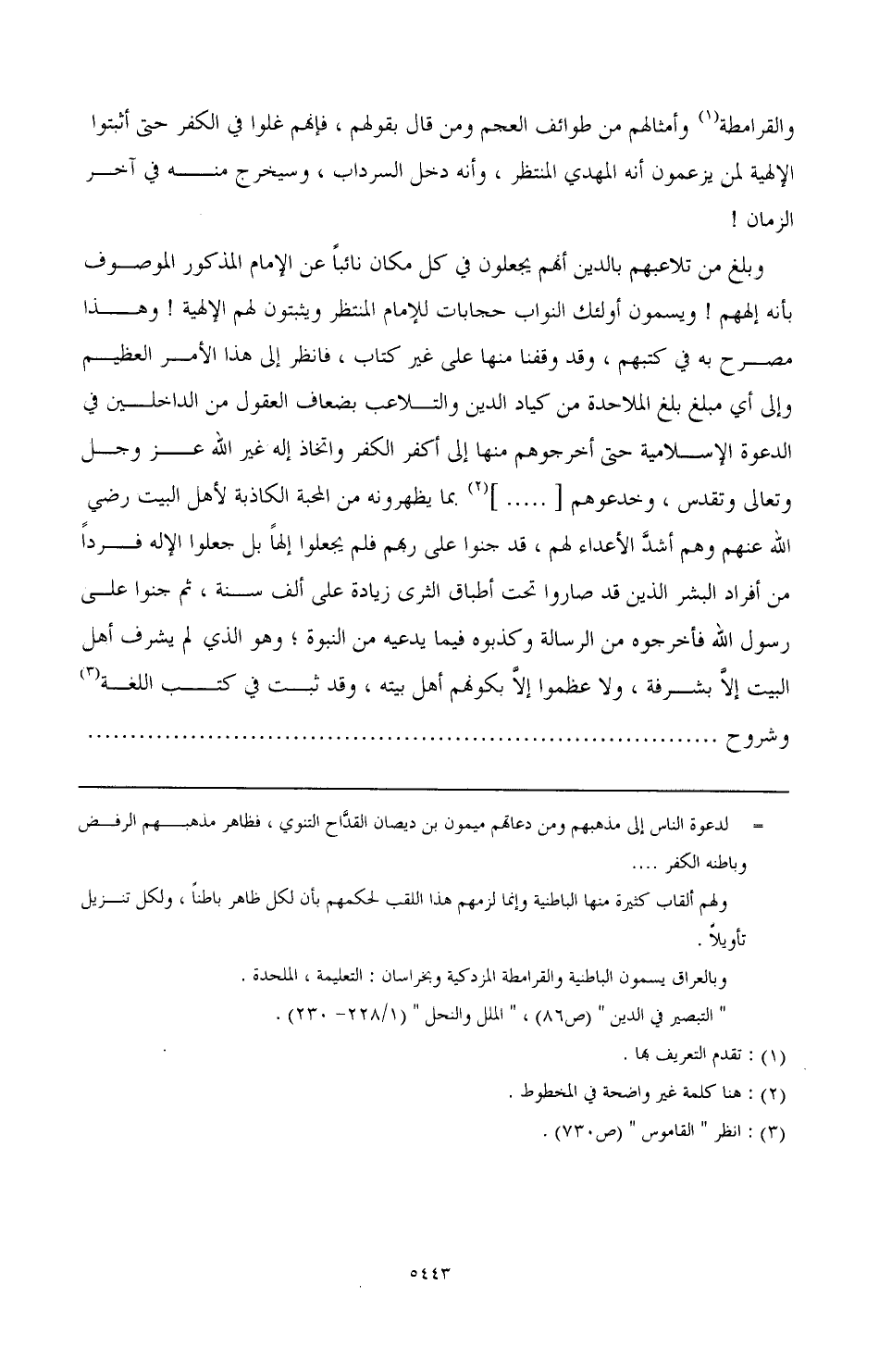 والقرامطة (¬1) وأمثالهم من طوائف العجم ومن قال بقولهم، فإنهم غلوا في الكفر حتى أثبتوا الإلهية لمن يزعمون أنه المهدي المنتظر، وأنه دخل السرداب، وسيخرج منه في آخر الزمان!.