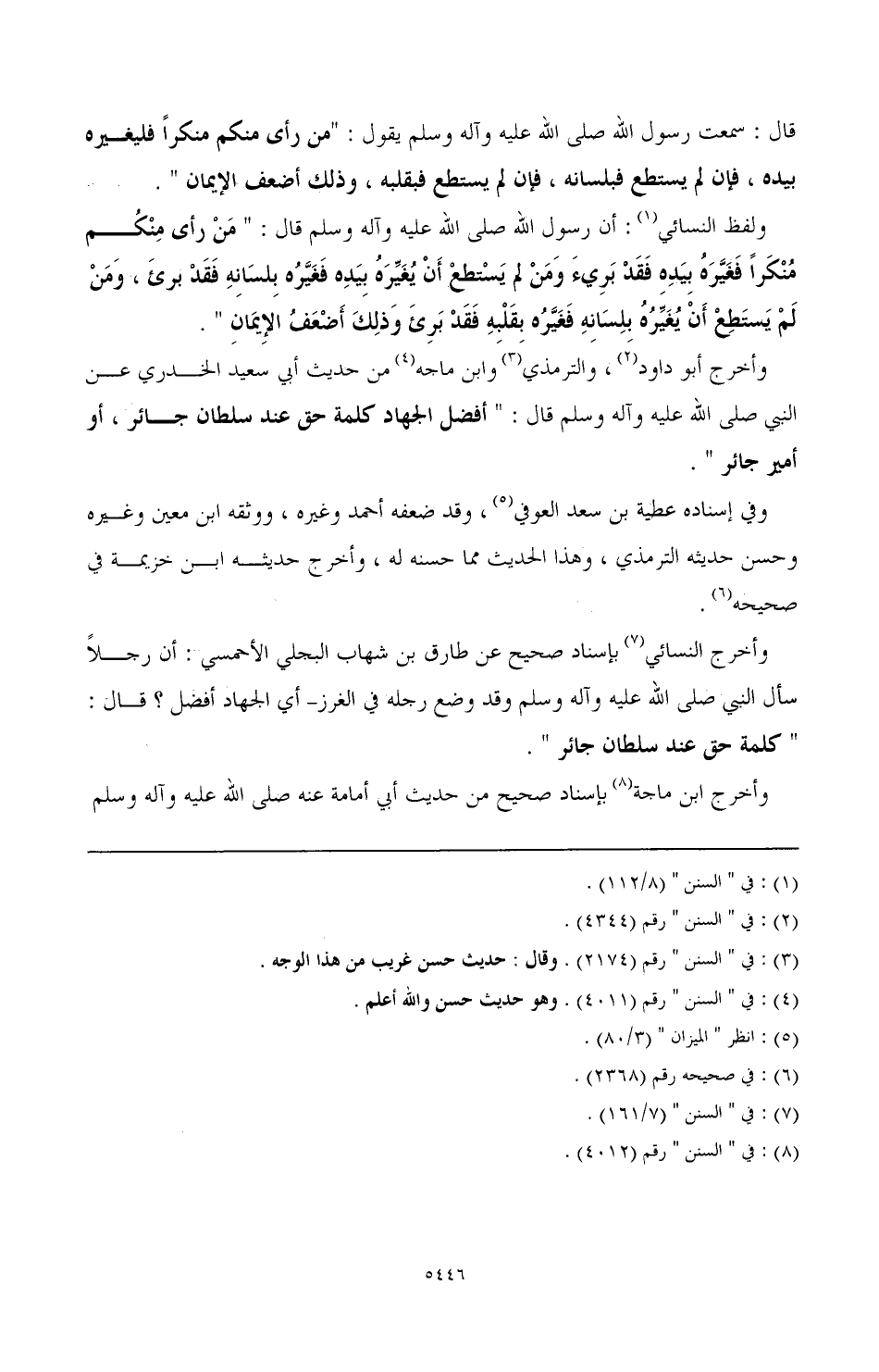 وأخرج النسائي (¬7) بإسناد صحيح عن طارق بن شهاب البجلي الأحمسي: أن رجلا سأل النبي صَلَّى اللهُ عَلَيْهِ وَآلِهِ وَسَلَّمَ - وقد وضع رجله في الغرز - أي الجهاد أفضل؟ قال: " كلمة حق عند سلطان جائر ".