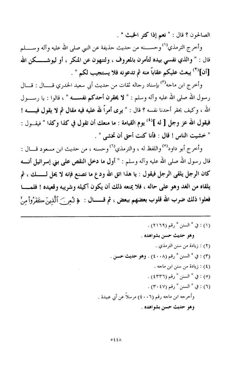 وأخرج أبو داود (¬5) واللفظ له، والترمذي (¬6) وحسنه، من حديث ابن مسعود قال: قال رسول الله صَلَّى اللهُ عَلَيْهِ وَآلِهِ وَسَلَّمَ: " أول ما دخل النقص على بني إسرائيل أنه كان الرجل يلقى الرجل فيقول: يا هذا اتق الله ودع ما تصنع فإنه لا يحل لك، ثم يلقاه من الغد وهو على حاله، فلا يمنعه ذلك أن يكون أكيله وشريبه وقعيده! فلما فعلوا ذلك ضرب الله قلوب بعضهم ببعض، ثم قال: