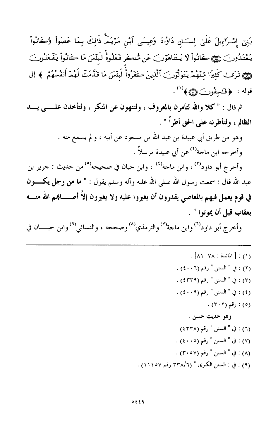 {لُعِنَ الَّذِينَ كَفَرُوا مِنْ بَنِي إِسْرَائِيلَ عَلَى لِسَانِ دَاوُدَ وَعِيسَى ابْنِ مَرْيَمَ ذَلِكَ بِمَا عَصَوْا وَكَانُوا يَعْتَدُونَ كَانُوا لَا يَتَنَاهَوْنَ عَنْ مُنْكَرٍ فَعَلُوهُ لَبِئْسَ مَا كَانُوا يَفْعَلُونَ تَرَى كَثِيرًا مِنْهُمْ يَتَوَلَّوْنَ الَّذِينَ كَفَرُوا لَبِئْسَ مَا قَدَّمَتْ لَهُمْ أَنْفُسُهُمْ} إلى قوله: {فَاسِقُونَ} (¬1) ".