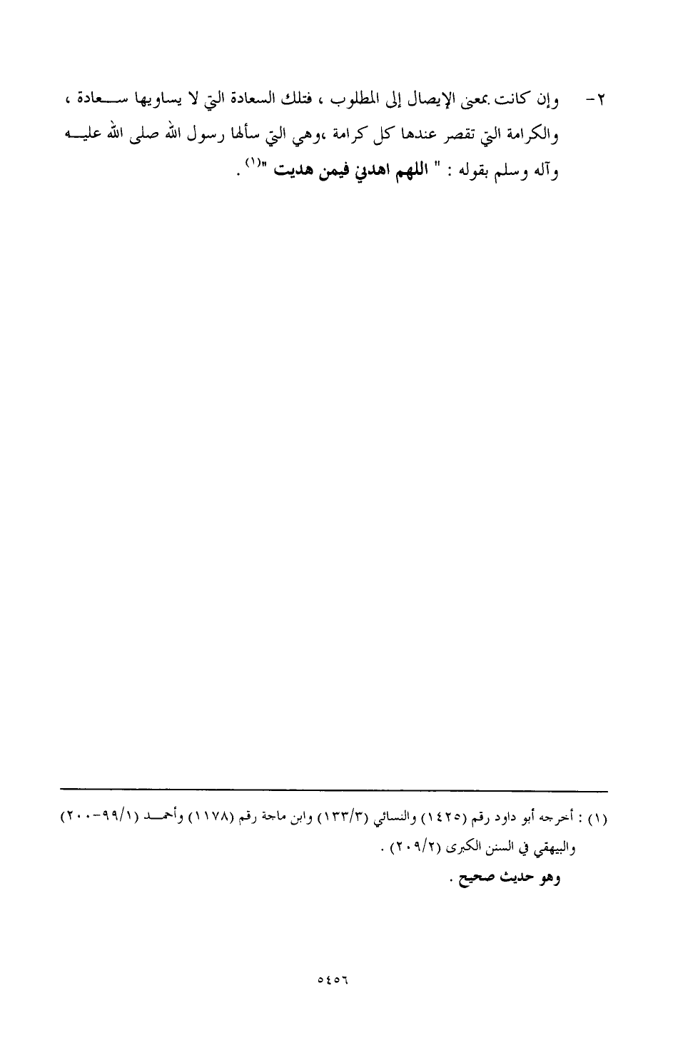 2 - وإن كانت بمعنى الإيصال إلى المطلوب، فتلك السعادة التي لا يساويها سعادة، والكرامة التي تقصر عندها كل كرامة، وهي التي سألها رسول الله صَلَّى اللهُ عَلَيْهِ وَآلِهِ وَسَلَّمَ بقوله: " اللهم اهدني فيمن هديت " (¬1).