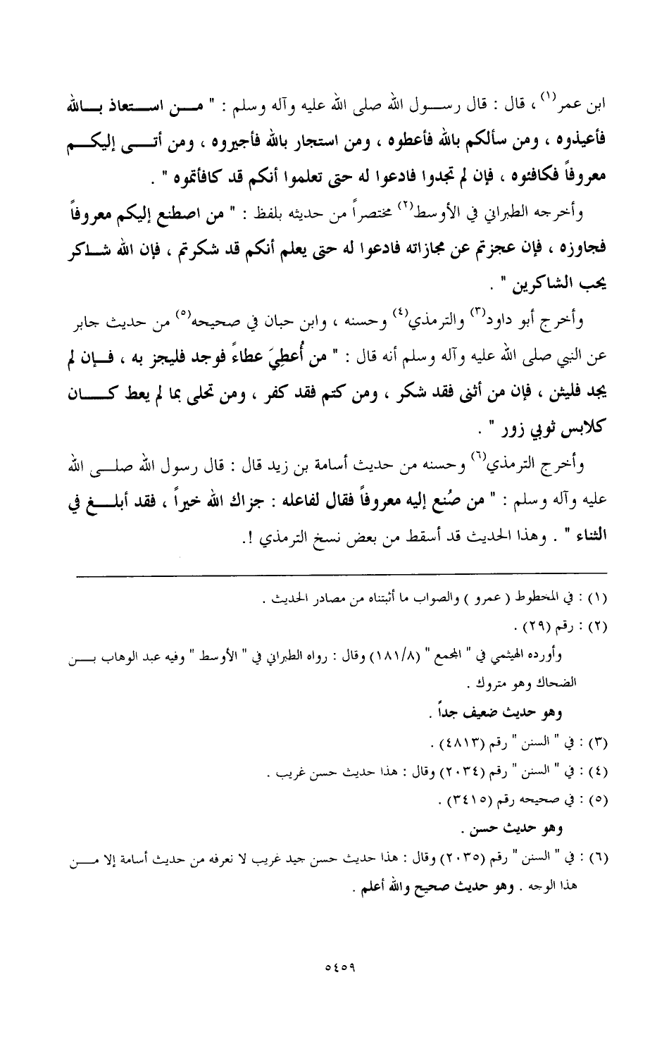 بن عمر (¬1)، قال: قال رسول الله صَلَّى اللهُ عَلَيْهِ وَآلِهِ وَسَلَّمَ: " من استعاذ بالله فأعيذوه، ومن سألكم بالله فأعطوه، ومن استجار بالله فأجيروه، ومن أتى إليكم معروفا فكافئوه، فإن لم تجدوا فادعوا له حتى تعلموا أنكم قد كافأتموه ".