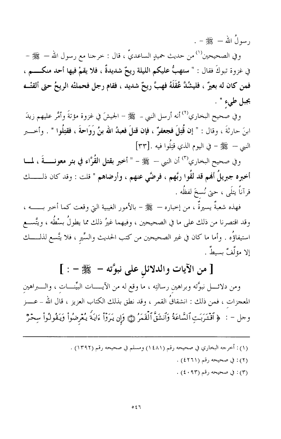 فهذه شعبة يسيرة، من إخباره -صَلَّى اللهُ عَلَيْهِ وَسَلَّمَ- بالأمور الغيبية التي وقعت كما أخبر به، وقد اقتصرنا من ذلك على ما في الصحيحين، وفيهما غير ذلك مما يطول بسطه، ويتسع استيفاؤه. وأما ما كان في غير الصحيحين من كتب الحديث والسير، فلا يتسع لذلك إلا مؤلف بسيط.