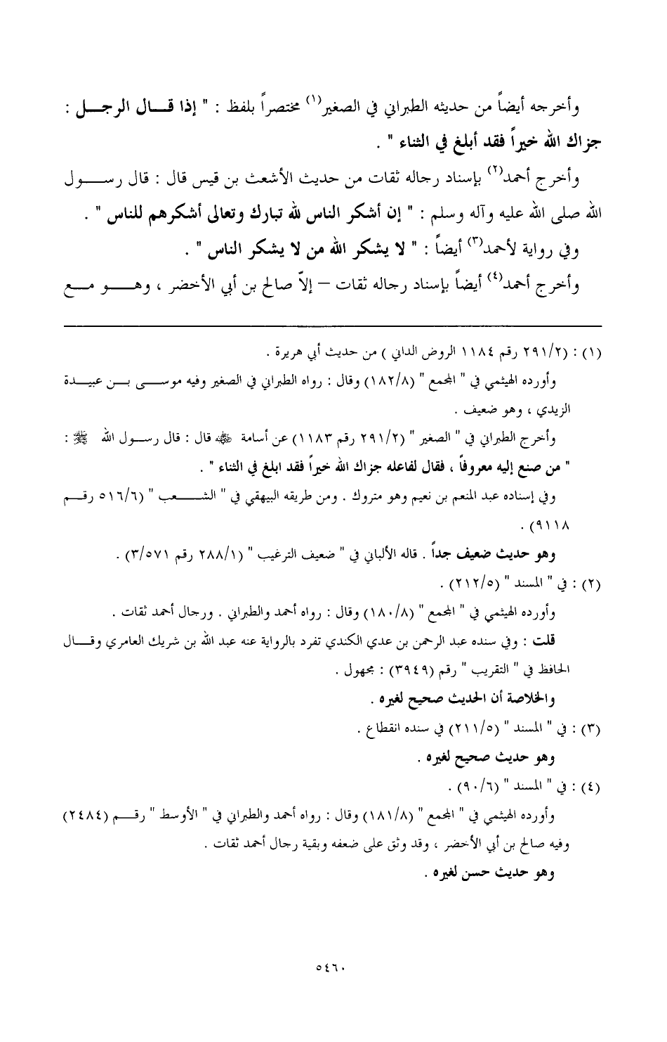 وأخرج الطبراني في " الصغير " (2/ 291 رقم 1183) عن أسامة رضي الله عنه قال: قال رسول الله صَلَّى اللهُ عَلَيْهِ وَسَلَّمَ: " من صنع إليه معروف، فقال لفاعله: جزاك الله خيرا فقد أبلغ في الثناء ".