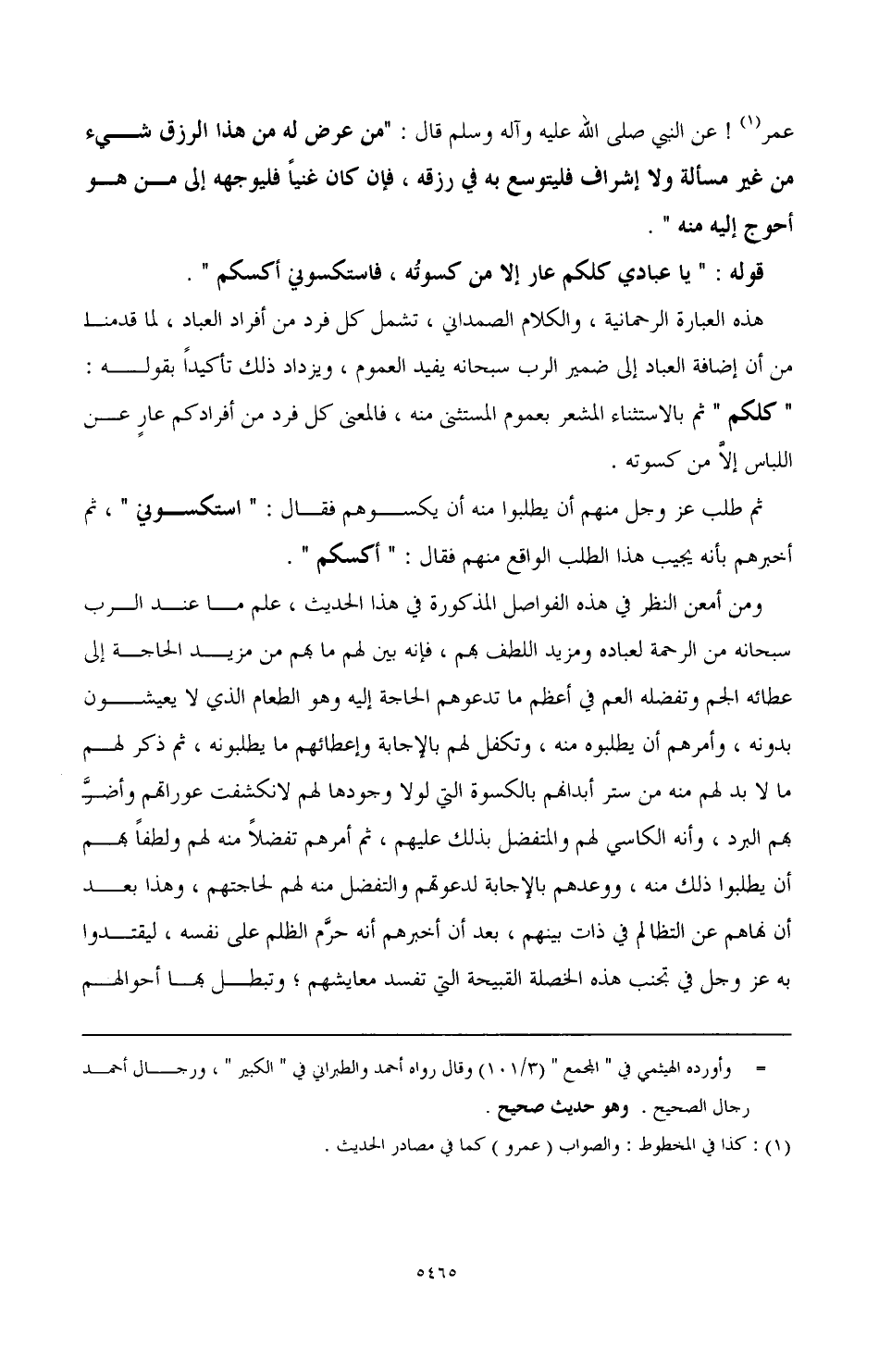 هذه العبارة الرحمانية، والكلام الصمداني، تشمل كل فرد من أفراد العباد، لما قدمنا من أن إضافة العباد إلى ضمير الرب سبحانه يفيد العموم، ويزداد ذلك تأكيدا بقوله: " كلكم " ثم بالاستثناء المشعر بعموم المستثنى منه، فالمعنى كل فرد من أفرادكم عار عن اللباس إلا من كسوته.